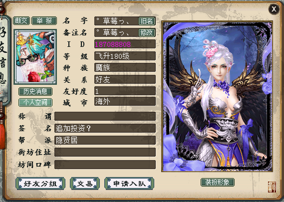 【采访语录】 记者莎草子:美女你好,我看到你很多冲5J神兵的记录,是近段时间的还是? °草莓っ、:最近时间的。 记者莎草子:全收的吧?大概花销了多少钱啊? °草莓っ、:全是收的。其实告诉你个秘密吧,本来我打算清号的,是因为队伍散了。走的走 不玩的不玩,所以也没什么意思了。把自己本身身上带的4级抽就想着冲了,结果上5了,然后就开始买神兵冲神兵了。 记者莎草子:前后买神兵花了多少钱呢? °草莓っ、:这个没怎么算过 粗略算下也就是1万多点吧~ 记者莎草子:能冒昧问下你的号总体投资了多少吗? °草莓っ、:投资没多少了该卖的都卖差不多了 就剩下一点升级宝宝了。 记者莎草子:这是决心一定要离开吗?其实大话里还有很多队伍在招队友呢~ °草莓っ、:也不是啦。这不是刚开完高峰论坛吗。我在等,等新的玩法出来在考虑投资。所以现在就暂时待定,其实现在我上号没什么事,也不打架也不PK 升级太乏味。所以没事就喜欢玩玩几率 记者莎草子:有多少神兵冲上去了的? °草莓っ、:我这人不行,玩几率有点大 4级的一般都是不要的。冲5一共是7个了吧 记者莎草子:玩的就是心跳啊,冲上去的时候刺不刺激?惊不惊喜? °草莓っ、:怎么说呢。告诉你个秘密。除了OS什么都没感觉。就是藕丝还有一点感觉 记者莎草子:女侠风范,换了我冲个一般的都得抖一抖。 °草莓っ、:我有数据控。要求完美 我冲的神兵都是极品。一般差点的都不冲。第一把是连击吸环 第二把人步定 第三把双回刀 第四把连击吸刀第五把是藕丝 第六把是藕丝 第七把是人法步定 第8把是双回斩妖剑 第9把是连击破 记者莎草子:说到高峰论坛,你最关注的是什么? °草莓っ、:最关注的就是PK。次于就是升级太乏味。还有就是任务发放奖励时间。大话现在好多人在坚持一般都是老玩家,我想有好多老玩家跟我一样的想法吧,都在等。等有一天像以前那样有平民玩家的舞台 PK多样化。 记者莎草子:你玩大话几年了? °草莓っ、:08年接触的大话,后来中间有两年没玩。这不05年开始玩的。说起后来玩大话也是闲下来的时候无聊了,无意中看见资讯然后就又投资进来了 记者莎草子:也是倾注了很多的时间和感情了~ °草莓っ、:是呢,我最怀念的就是08年的那时候 那时候有一个4介就可以进入PK了。那时候玩家都很积极。最怀念就是我们以前帮派每每到帮战时候都是提前上来等队员。好多队伍队长负责提醒队员,帮队员开号。那时候真好啊 记者莎草子:哎~我就怀念最初的朋友,大家都不会玩,可是却是那么开心~但内心还是爱着这个游戏的 °草莓っ、:是呢。不然我也不会这么滴老是放不下了。现在我基本都是偶尔上来看看朋友什么的 站在这发个呆什么的 记者莎草子:还准备继续冲神兵吗? °草莓っ、:没事的时候就冲冲 先把功绩完成啊 记者莎草子:好。。。好吧,这可不是一般的功绩,反正我干不了。。 °草莓っ、:如意天,快了。 成功冲的功绩快达成 记者莎草子:我都佩服死了~冲碎了多少? °草莓っ、:没多少 30多个了吧。冲碎的。 但是还好上去两件藕丝。但是我连击环跟双回刀上6的时候碎了 记者莎草子:现在五级藕丝市场价多少? °草莓っ、:1.4W我卖了一双 第二双也被定了,我计划下次在冲上5级藕丝 直接上双6试试看看什么心情。 记者莎草子:心态也很重要~ °草莓っ、:我的妙音鸾女刚收了个丹准备吃吃看。我吃这个都没变过。其实变不变无所谓 我要的是数据。。。 记者莎草子:这个无所谓了,变色不变色我觉得不重要,关键还是最后看你的宝宝强不强 °草莓っ、:对,现在就是亲密还有技能搭配 记者莎草子:你对大话的研究深吗? °草莓っ、:不深,只是每当新东西出来都想先去尝试。什么BOS啊 什么新的副本啊 等研究透了就不怎么去了 记者莎草子:你是有求知欲的人。 °草莓っ、:我也不知道为什么,其实他们都说我不适合玩大话。我总是很要强。就以前魔王窟刚出来那会我记得我跟朋友整整刷了一天 什么都没干 通关了 后来就不怎么刷了 记者莎草子:要强的人很累 °草莓っ、:是呀。 记者莎草子:感觉你是个直爽干脆的人,挺喜欢你这种个性的 °草莓っ、:随性吧。我这人跟谁都玩的来,一般朋友找我帮忙我都会帮。 记者莎草子:你这样的人朋友肯定多,因为跟你相处不累啊,很晚了我也不多耽误你,谢谢你接受我的采访,祝你件件神兵都上六~ °草莓っ、:好滴。谢谢您。 【后记】 草莓是个干脆直爽的女生,我很欣赏她说的一句话“你不去尝试就永远得不到”~有时间了我也去冲我的神兵去~~ 翻页来看看草莓的冲神兵记录,还有真人秀哦