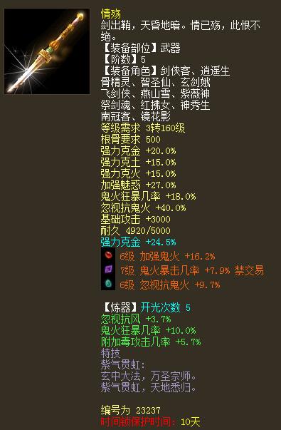 如今玩仙器女鬼的大多以四阶为主,拿五阶武器的并不算多,今天就看到这样一位五阶鬼火女鬼。其配置真心算非常给力了! 看看这位女鬼的展示,亮点非常之多: |