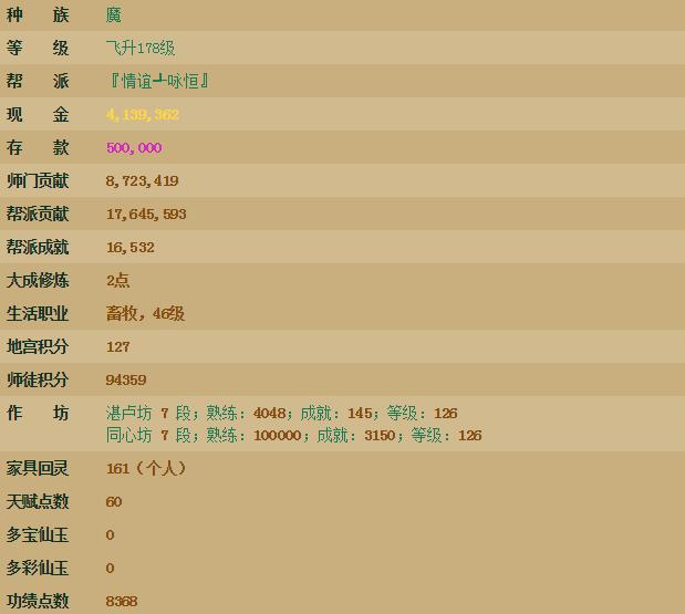 一售价十三万的女魔展示,装备仙器搭配神兵,宝宝年兽搭配终极,各个细节看起来非常不错! 分享一下这个女魔的内容和大家鉴赏鉴赏,先来看看底子的情况: |