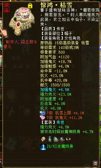 四阶惊鸿女鬼,展示一下装备细节,先看这套属性,粗看其实没有多大亮点,现在帮派啊,月卡啊各种加成太多了,这个没有加成的属性看起来平淡无奇,但是大家看过我的装备细节,就知道我这套属性来的多么不容易了~ 下面这个,是不是看起来舒服得多呢? |