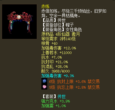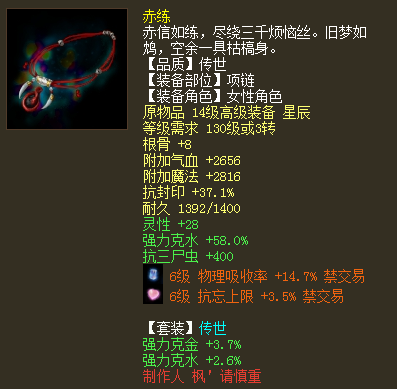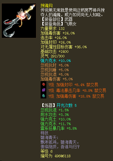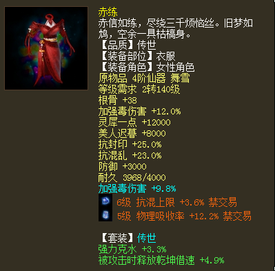 六级神兵搭配四阶仙器套装,在于归、赤练、白骨套装中来回切换,这样的一位女人族玩家算不算玩得很6了? 展示一下她的全身装备搭配,看看能否算个称职的毒女了? |