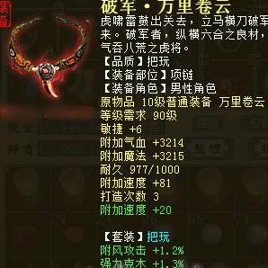 发一发自己的平民3000敏男魔,先说一些自己的想法吧: 1.平民打PK就是冲着混奖励去的,没奖励的PK不打。打天梯加男仙的星阵,抗灵宝不到40,进战斗15000MP,所有高敏单位都是30%以下MP进战斗的,遇到的对手也不怎么样,天梯男魔第一回合几乎没被疾风骤雨砸死过。实际上在队伍男仙有星阵之前,15000MP进战斗,低端PK的镜子也奈何不了男魔。抗冰是一定不抗的,在这种档次的PK中,对手能出冰,我直接认输召回。 2.男魔装备: 鞋子223块钱公示期点的; 衣服自己炼化的。500W的底子,估计也就能卖5000W,1E不能再高了吧,就算250元; 帽子也是自己炼化的,也算个250元。毕竟抗性不好。 武器是5000W还是7000W记不得了,也算250元好了。 项链印象中1300W买的黄字,自己追加的,也还算250元好了。 星卡3.5E买的,买好久了,不知道现在的市价,也懒得去藏宝阁看了。算900元好了。护身符忽略不计。 6个7级全敏PS,就算1000元好了。 全套装备3500元左右。 套装属性懒得洗了,也不值得洗。毕竟只打低端PK混奖励。 变响马卡,修正加17%速度到3074。如果变FS,修正加19%,速度大概是3074÷1.17×1.19=3126。吃速度30符文,3150以上速度。 最后一张平民400灵性仙,2600多的速度。