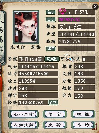 刚鼓捣的霹雳女龙,没有套装,装备也没有怎么炼化,牛魔就是普通5抽,上一些塔和竹子的伤害图吧,先看属性: