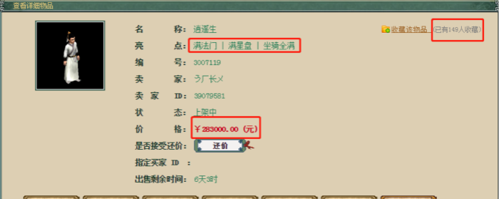 近日一售价283000的男人号现身阁子,一身稀有装备配上各种单挑专用召唤兽,看惯了日常物资的童鞋们来欣赏一下不一样的单挑男人风采: 价格、亮点和超百人收藏