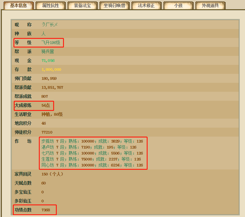 等级、大成、作坊天赋、功绩都很给力