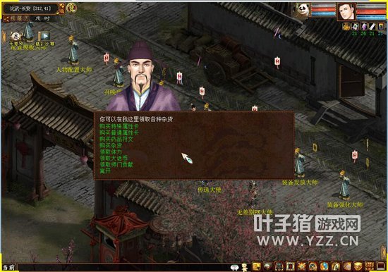 杂货商人: 这个NPC处可以领取变身卡、药品、符文、金钱、师门贡献等