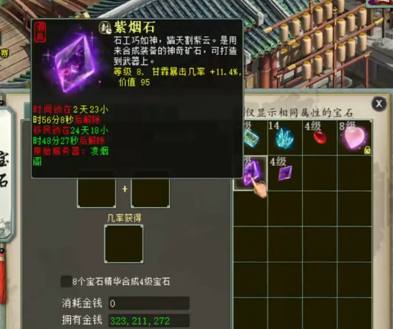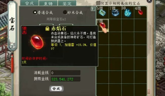 今天这个宝石合成的故事,要从藏宝阁买货开始说起,这位兄弟先是点了一颗大话西游2七级赤焰石,而后幸运合成8级,但他在兴奋之下没有控制住双手,竟直接拆下自己武器上的8级石头,想要勇闯9级?这就有点夸张了! |