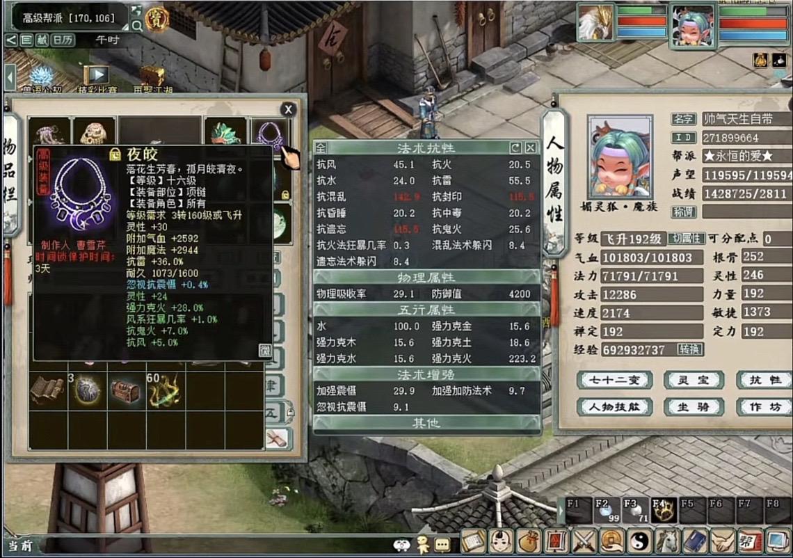 快到年底,又是回归热潮,这位玩家思来想去,还是决定打造一个万金油式的忽视抽女魔,目前星卡还在升级,但是整体属性已经可以胜任日常任务了,下面来欣赏下这枚大话西游2女魔的装备吧! 站街忽视抽9.1,强抽29+,克火220