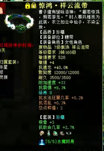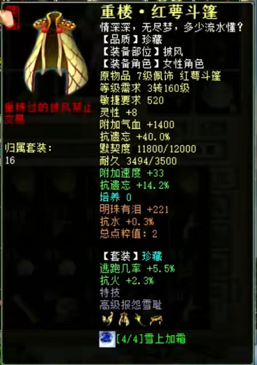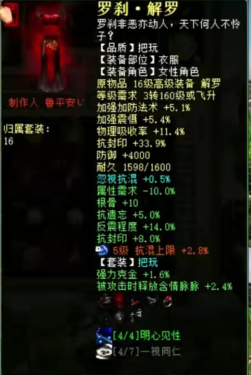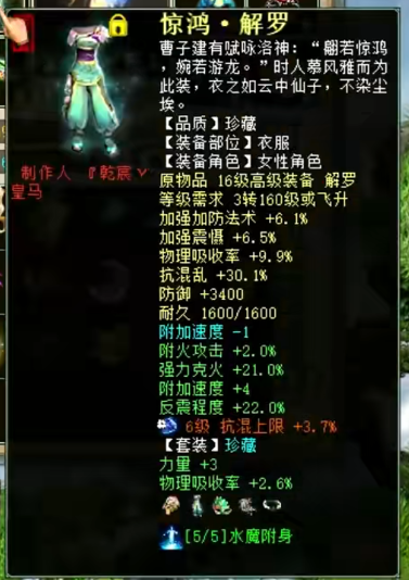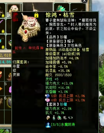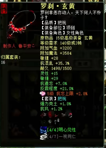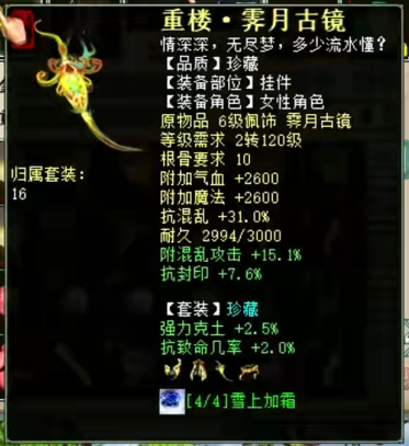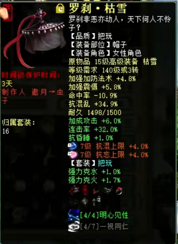 展示下自己队伍的女魔号,现在主要就是打辅助,杀16星主要负责明心和下雪,走的是连击附混的路线,然后任务的话就换惊鸿套,克不高,够用就行。 杀16星装备属性展示 属性及抗性展示,变的金不换物理卡 杀16星时主要负责明心和下雪 五级附吸枯骨刀 衣服 帽子 鞋子 项链 护身符 高级报怨雪耻披风 挂件 双忽视抽星符 日常属性装备展示 日常克火属性及抗性 衣服 帽子 鞋子 项链 腰带 [编辑:叶子猪小秘书]