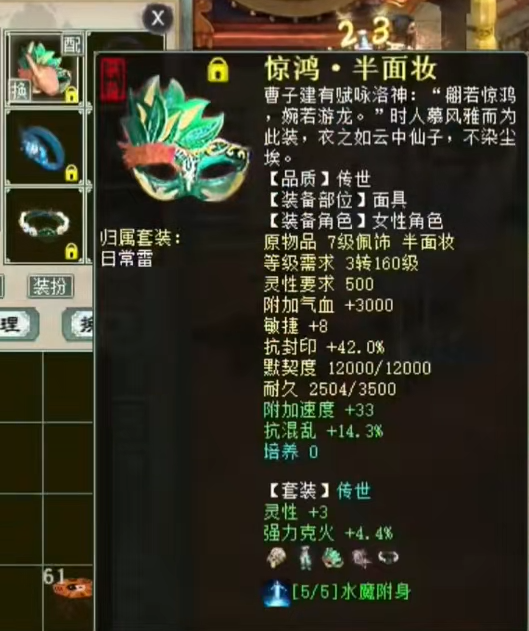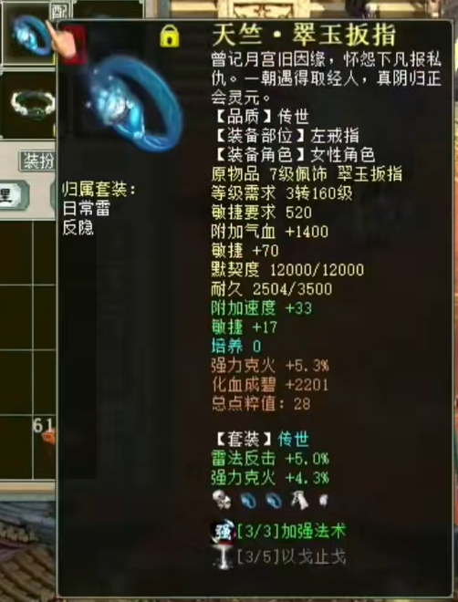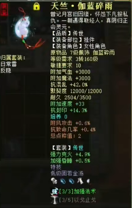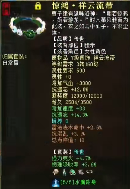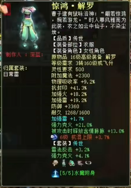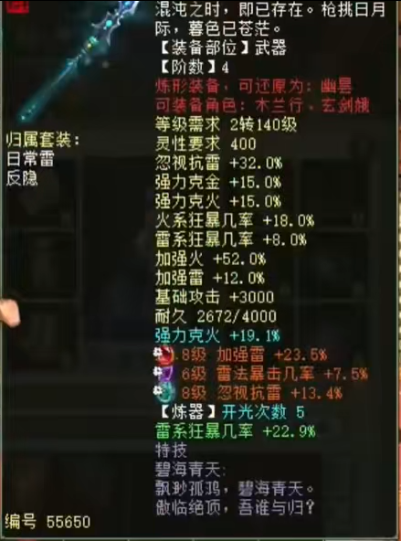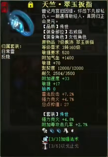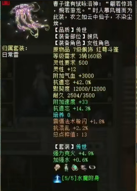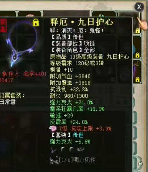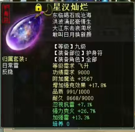 大话西游2玩家展示一个克火四阶雷法仙,800灵性加点,克火346.4+强雷108.5+忽视雷52.5+雷暴程度40.1,以下是详细属性、装备与秒木人桩的伤害,来看看吧。 属性及抗性展示 双法门技能一览 四阶武器 帽子 衣服 鞋子 项链 护身符 赤马星符 披风 低级固若金汤挂件 面具 左戒指 右戒指 腰带 秒木人桩伤害1 秒木人桩伤害2 [编辑:莫听雨]