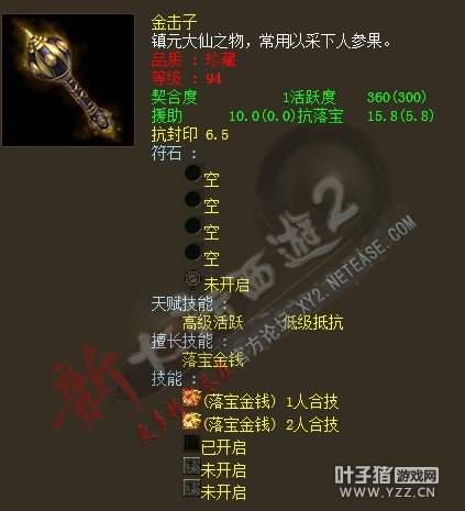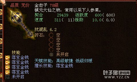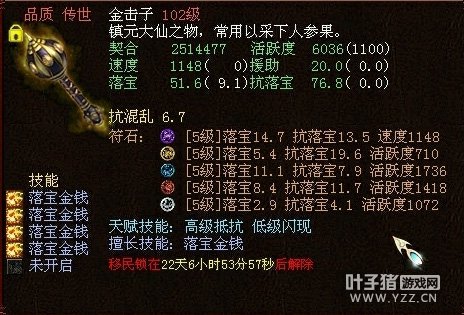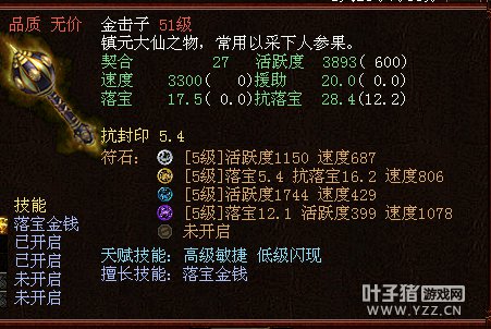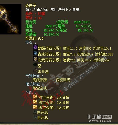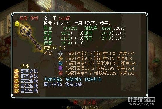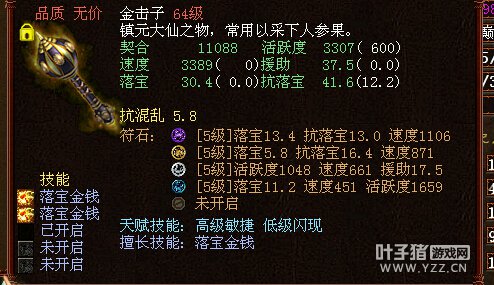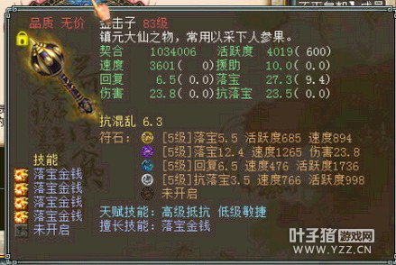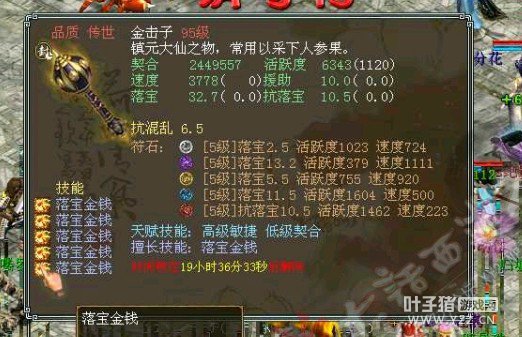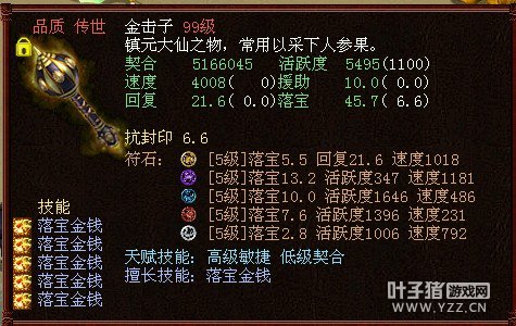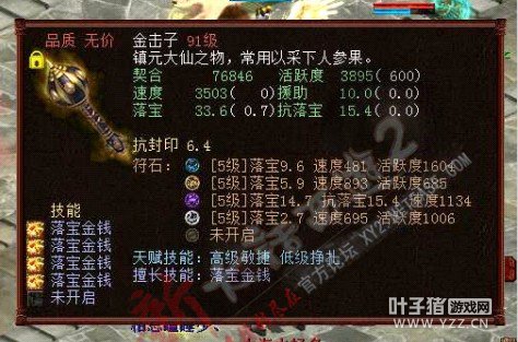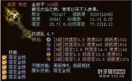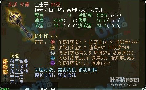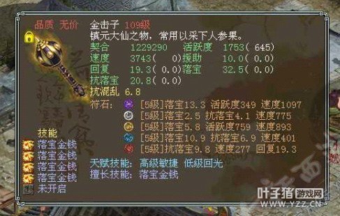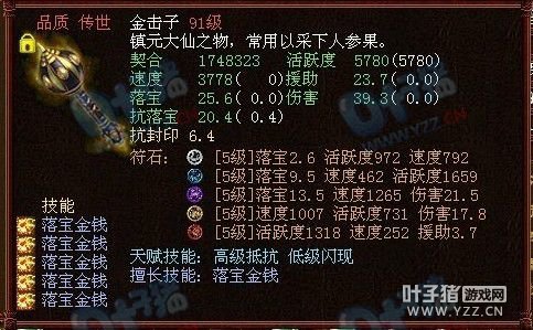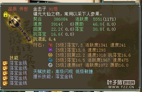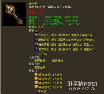 很变态的金击子,速度提高到了4500,符石打造很逆天,特别是青龙符石绝版的超高敏。 >>推荐阅读:灵宝里的伪男鬼 毒针轻刺回血10多万不难 由于提高敏难免活跃和抗落宝滴,但天赋技能是低级活跃,并且初值有抗落宝灵宝的初值和符石的搭配上很不错。翻页有更多给力金击子哦! <<<点击进入大话西游2论坛参与讨论>>>