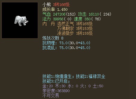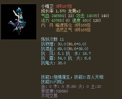 当你带着系统赠送的宝宝修罗时,突然直接领悟了一个终极技能,这到底是悲是喜? >>推荐阅读:星魂特技盘点:甘霖瑞雪或可回复43万法 小编今天就搜集了藏宝阁带不可交易终极技能宝宝的号,这些号有的价格和号中所带的终极技能价格相差甚远,不知道各位小伙伴会不会买这样一个不能交易的终极技能宝宝号?大家一起来看看! 一、化无篇 二、当头棒喝篇 三、春回大地篇 四、子虚乌有篇 五、以牙还牙篇
