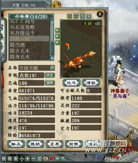 大家一般如果不玩PK的话,很少会去给自己的召唤兽点天赋,尤其是五级天赋,那必须是神兽才可以升级的,今天让我们一起来看一只神兽蝎子直播升级五级天赋。 |