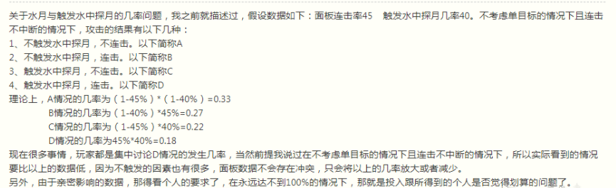 本文转自大话论坛;作者:嘟嘟嗷嗷 1、水月转圈是受对面站位的限制,攻击单位(前后左右)没目标她不转。 2、水月转圈的连击次数最大为3次,很大程度上限制了觉醒的发动几率。(因为很难前后左右都有站的!很难达到满目标!) 3、所有的召唤兽连击次数都是,只要连击,必定1+9次。(50W亲密以上) 并且连击开始之后,后面的9次100%命中,伤害递减。同时,所有召唤兽兽装觉醒的发动几率也都是根据连击1+9次而设定的! 而水月,转圈第一次砍中,第二第三次未必就可以砍中。同时,发动转圈时,未必就连击,也有很大几率只转一圈。 这有上次大神分析的数据: 图中举例转圈几率为40%;1000W亲密转圈几率为40.6%;也是高亲密数据。 单体不连击几率33% 单体连击几率27% 转圈不练级几率为22% 转圈连击几率为18%(这18%几率里面有转两圈和转三圈) 通过数据可以看:水月转圈的几率 + 水月转圈的次数限制 + 水月被队形的限制互相制约之下。 他的觉醒发动几率也被制约的大打折扣!