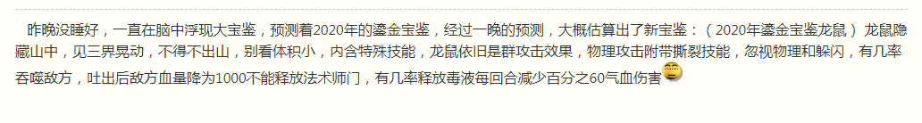 大话西游2自从2012年8月15日周年庆推出限量版客户端礼盒《鎏金宝鉴》以来,到现在已经有8个年头了,每一代的鎏金宝鉴产品都伴随着一只宝鉴召唤兽的问世,我们就来历数一下每一代的宝鉴宝宝。 第一代宝鉴召唤兽:龙马 ![]() 这只召唤兽是最早的宝鉴召唤兽,在新出之际着实为广大玩家所喜欢,当初更是以有一只龙马而骄傲。其自带技能效果“双破物理”着实给力,可以随着亲密的提高而提高,网上更曾爆出过双破物理90+的龙马。 尽管是第一代宝鉴宝宝,但其拉风的造型和给力的技能还是为广大玩家们所接受和喜欢,就算是8年后的今天,还是有玩家选择这只召唤兽的,而且单挑一族必备就是龙马配无极觉醒。 第二只宝鉴宝宝:画皮娘子 伴随着龙马成功受到玩家的喜爱,第二只宝鉴宝宝:画皮娘子登场。 ![]() 画皮娘子一改第一代宝鉴宝宝的兽型造型,大胆采用人型造型,其当初投放后的惊艳程度可想而知,其技能特点主要是加成连击率和加成分花高分概率。用一句当时的话说就是,我带的画皮爱出连击,人送外号“画皮转圈圈”。在那个大力宝宝为主的年代,有一只容易出连击的画皮娘子,绝对是升级和日常任务之利器。 2014年推出了三代宝鉴召唤兽:孔雀明王 ![]() 这只宝宝沿袭了2013年画皮娘子的人型风格,造型更加威武,其自带技能有几率出现2倍、3倍、4倍伤害。这只宝宝在当时出现之后更是迅速走红,比起龙马的破物理,画皮的连击,孔雀明王可是有几率会一次击杀目标,看着攻击动作上方闪出的多倍伤害,那种感觉简直不要太爽啊。 2015推出了第四代宝鉴宝宝:北冥龙君 ![]() 提起这只宝宝,它很独特,造型霸气侧漏自不必说,这里主要说它的自带技能,它没有提高自身属性的技能,它的技能特点在于其触发连击时的特殊攻击效果:伤害只递减到第一次伤害的80%,以此类推,最多连击7次,而且无视反击和保护。这就造成了其只能连击才能触发技能效果,而且连击被躲闪的话,连击中断... 这只宝宝的出现,只能说之前几位前辈太过强悍,而现在龙君的地位相对前几代宝鉴宝宝要差,但是在比斗场其出场率和效果还是很不错的。 2016年推出的史诗级宝鉴召唤兽:孟极 ![]() 这只宝宝推出伊始,就被玩家们不断诟病,其技能效果在当时普遍不被玩家所接受。之前的宝鉴宝宝都是自身属性能力的提升,而孟极却是出现魂影攻击,而且是每三回合获得一次能力,这在当时人们习惯了宝鉴宝宝自身属性加强的年代来说,普遍都不看好这只宝宝。 直到后来,这只宝宝完成了神级反转,现在孟极的价值是所有大力宝鉴宝宝中最高的,实战效果也是最好的。 究其原因就是孟极的出现改变了之前大力宝宝的点杀攻击方式,其最多出现三只魂影,由点到面的攻击方式转变,完全改变了人们对这只宝宝的认识,以至于后来开发组强制对其进行削弱,但是仍挡不住玩家对其的热爱程度,价值一路走高。 2017年出现的第一只法术系鎏金召唤兽:妙音鸾女 ![]() 在那个以大力宝宝为主的年代,这只法术召唤兽的出现可谓是空前绝后,但是其出现之后,热度马上削减,在当时2亿左右游戏币左右就能买到。毕竟玩家们习惯了大力宝宝冲上去拳拳到肉的畅快感。 就在所有人认为这只宝宝毫无用处的时候,变化悄然而至,妙音搭配觉醒技能法力灵动的效果被玩家们所熟知,任务中的一些大概率躲闪怪,抗物理怪,也更是要依靠法术系妙音所击杀,而其技能产生的音势伤害更是排除了敌方所有抗性之外的真实伤害。 妙音鸾女崛起了,价值甚至超过了孟极,长安桥上喊得是:一条龙任务来妙音单位,可见其实战作用之强大。 2018年推出的宝鉴召唤兽:水月镜花 ![]() 提起这只召唤兽,我想起了曾经一位玩家的话:妙音鸾女像小丫鬟,水月镜花才是贵妇人。当然这只是玩笑话。 水月镜花经过了上一只法术系召唤兽的缓冲,从刚一问世,玩家群体就对其恩宠有加,其外形更是美丽贵妇形象,外貌协会的人表示有点hold不住。 其技能效果用一位玩家的话说就是:我一出手,就是一大片。除了触发的特殊“一划拉一大片”的攻击方式外,攻击完成后更是会触发“雾里看花”被动技能效果,造成此前伤害百分比伤害的再次伤害,不可谓不强大,价值方面直追孟极。 2019年推出的宝鉴召唤兽:龙兔 ![]() 注意其宣传标语:首只会说话的召唤兽。其自带技能姑且不论,就其颜值和其自带语音包来说,这只宝宝大概每一位女玩家都会带一只吧。对于其技能就不再多做评价了,毕竟前面有5只大力宝鉴宝宝打前站呢,最后还是想说,这家伙太萌了。 2020推出的鎏金宝鉴召唤兽:??? 说了这么说,终于说到今年的了,随着时间离周年庆的日期越来越近,广大玩家们所关心的鎏金宝鉴宝宝也越来越临近面世,到底今年会放出什么类型的召唤兽,我们现在可以大胆的做出猜想,以下内容取自网络。 ![]() 龙鼠?貌似和龙兔有关系... ![]() 法术系?秒好多次? ![]() 话说偷东西不太好吧...那位回复帝,2021年的宝鉴就靠你了 ![]() 这条还貌似有点靠谱 ![]() 复活?这个太强大了 笔者在经过了一系列的采访后发现,一千个人有一千个哈姆雷特,每位玩家都针对于自己的需求和爱好来构思、猜想2020年的鎏金宝鉴宝宝,不可谓不用心,也证明了广大玩家群体对这款游戏的钟爱。 最后祝广大玩家游戏开心,更欢迎玩家朋友们大开脑洞,对今年的鎏金宝鉴召唤兽做出更多的大胆、有意思的猜想(万一您说对了呢,