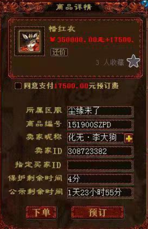 尘缘未了老区,一老铁给新点出问号的惜红衣修终极,先来看看过程: 不到10分钟,这只新毕业的惜红衣以35万的价格被挂上了藏宝阁,大家算算这波赚多少?不知道会不会有土豪瞬秒呢? [编辑:djoeng]