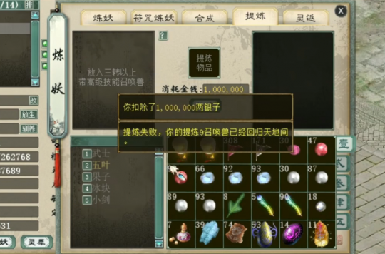 大话西游2提炼又开始啦,今天这位兄弟总共准备了9只召唤兽,其中有衙役这种小宠,也有冰雪魔这种大宠,不知最终能成功几只呢? 第一只