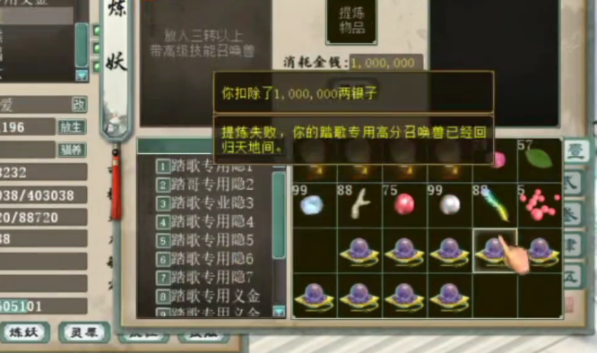 目前有这样一种说法,在提炼大话西游2聚魄丹时,选择高价值的宝宝几率会更低,而低价值的反倒更容易成功,到底是不是这样呢? 今天这位兄弟准备了十只召唤兽,其中全是义金,隐身等价值不菲的宝宝,咱们来看看成功率到底如何? |