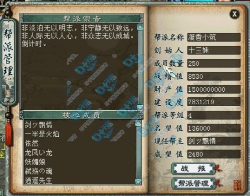 凝香小筑,原灵兽村帮派,其创建人“十三妹”,帮派最初是由逍遥先生跟清风家族共同发展起来的。今天在情人谷的地位也是由所有帮派成员共同努力的成果。 帮派现任帮主 剑ッ飘情(原名青青子矜)。 帮派核心人员:逍遥先生,清风の浪子,一半是火焰,依然,龙凤龙,北方王子等。 |