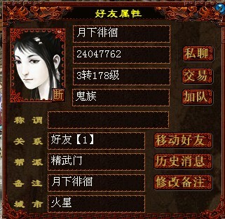 月下徘徊:队伍火力女鬼,以下简称徘徊! 小记:您好,请问现在有时间接受下采访吗? 徘徊:好的。 小记:怎么想起玩个负敏女鬼呢? 徘徊:有两个方面吧 一个方面是队伍的需要另一个方面是战术 小记:您觉得负敏女鬼和中敏女鬼比起来怎么样?现在玩中敏女鬼的还是比较多的,可以控制,也可以火力! 徘徊:其实说实话我以前也是中敏的 但是我觉得鬼加敏,敏不是很多!反而失去了血,倒不如转成-敏的女鬼! 其实仙号是血仙 我和仙号加点换了一下 小记:-敏女鬼的话会不会在控制力上就减弱了很多呢? 徘徊:不会吧 因为我们队有两个男人控制上不会拉下,我只当自己是火力了! 小记:蒽,确实是要看队伍配合了!您这个号到现在投资了多少钱了? 徘徊:其实这个号是我叔叔投资的 他们都称之为寒哥 我是有空没口来帮帮叔叔玩的 我估计应该有30W左右吧! 小记:叔叔?您的亲叔叔吗? 徘徊:不是啦 是我在大话中认识的啦 又因为认识的时间很长 大概有5 6年了吧 !他比我年纪大很多我又很小 只可以叫叔叔咯。