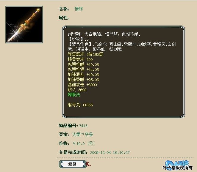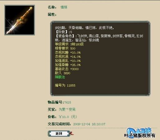 7、五阶仙器十元出售,是卖家糊涂还是另有隐情 五阶仙器十元交易成功,再有钱的玩家,这都价值一万多RMB的物品了,不至于这么不谨慎吧?究竟是什么原因呢? 相关链接:http://bbs.yzz.cn/viewthread.php?tid=1742857 8、4阶仙器被骗,担保交易谁是谁非? 是谁导演这场戏? 在这交易角色里。 对白都是自言自语, 最后就是无能为力, 看不出什么结局。 |
