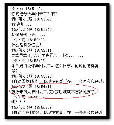 七七:你是什么时候发现号被人找回去的? 茜茜:1月8日晚上我准备上号帮站,结果上号时说帐号已被锁定,然后我上鬼号问朋友,飘渺书生说中午11点左右看到有人上号,和我号说话,一直不回话。书生教我1月9日早晨7点去用安全码再锁一次,我锁成功了,结果到1月10日晚上我看见那号在线,我再用安全码改密码,发现安全码不对了。 七七:安全码不对的话,就是用身份证改的吧,神兵和群的对话,很显然的,神兵知道是她所谓的亲戚把号找了回去。 神兵和浮尘群的聊天记录: |