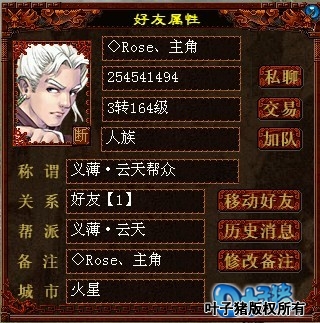 以下是小记对◇Rose、主角的采访记录: 小记:你好,我是叶子猪记者、夕锦若梦。 主角:你好。 小记:影子说你不玩了,有什么难言之隐么? 主角:其实也没什么特别的原因,主要是我的号是三世女魔转的,感觉鸡肋了点。 小记:现在还是有一些血男人愿意这样转的。你是感觉哪里不好呢? 主角:血男人的确很厉害,但是现在抗的都好,闪混的几率太高了,没用的,我现在中敏还是觉得不行。 小记:那打算重新玩一个超敏男人么? 主角:嗯、我这个号转只用了52天。 小记:现在重新练,打算冲记录么?个人知道最快的是46天。 主角:你可以看看我们区的狂人榜、看看我的ID、在看看前十的ID。 小记:我看到了、前十除了你都是248开头的、你是254、火箭速度呢。 主角:现在师门改了,应该可以46天之内转的。不像以前一星期就那么几次师门,每次都是级满了法不满,要浪费几天呢。 小记:那倒是转了记得找我噢。 主角:好的,如果我开始练的话,我当你面建号,然后你看着我升级。 小记:今天是你的生日,我代表叶子猪记者团祝你生日快乐。 主角:谢谢你。