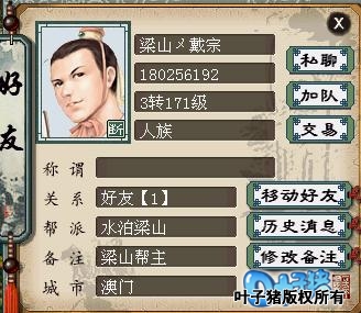 水泊梁山帮主: 【以下简称戴宗】 小记:您好,我是叶子猪记者心仪,采访下最近帮派斗争的事件。您有空么? 戴宗:可以啊。 小记:恩谢谢,此次四大帮派之间的斗争,您觉得会影响到其他级低玩家的升级么? 戴宗:呵呵这个嘛,玩游戏就是玩的刺激,不刺激谁玩。 小记:那对于其他帮中不参与事件的人员会受到牵连么? 戴宗:他杀我们帮的,我就杀他们帮的。他偷袭我们帮的成员,我们也不会袖手旁观地,不参与偷袭的人,我们也不乱杀啊。 小记:恩,那这样就避免了很多练级中玩家的无辜受牵连了。那对于这次事件帮主有没有想过以和平方式解决呢? 戴宗:都杀很久了,还和平的了吗。再说不杀也不刺激啊。 小记:听说此次帮派的斗争是三个帮派针对一个帮派。您的帮派是怎样加入进来的呢? 戴宗:本身就是我们帮在杀,他们帮太让人气愤了,引起公愤了,所以就都加入了。 小记:那是以什么方式引起公愤的呢? 戴宗:他们主队都拿5阶带神兽,欺负区里没实力的队伍,所以引起公愤了。 小记:看来恩怨是发生在主队之间。恩,谢谢您此次接受我的采访。