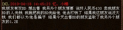 小记悲剧滴发现,我的人生简直是一场莫大的悲剧,就立刻被人QQ上敲了好几块砖。曾经有个玩家向小记叙述过一双BD被骗的事情,小记当时在学校已经给了他名单联系其他人,结果他又回头了,因为这个事情发展出乎意料了BD事件一时处理不下,又有个好友的1E2的DHB疑被骗子所取,又一直联系不到活着的记者。一双3J鬼法步定乾坤履,究竟引出了什么风云? 引子 图二