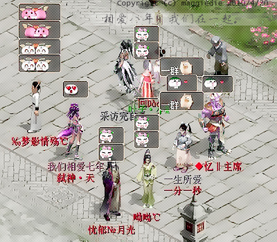 小记:说说你最好的好朋友是哪几个呢?介绍一下吧。 过去:婉儿,相缘,清茶,红蝶,情女,分分,弑神天,忆主席,伤心,佛云蓝月。呦呦,和他老公,分分,天我们是一个帮的,在一起玩的也不错,就互加好友了。天那人怎么说呢,平时话很少,奶茶嘛因为是女孩子话也不少,分分那人是属于搞怪类型的反正没事了就在帮里逗我们。我一般在的时候都要和我老姐(哟哟)聊,当然有时候是姐夫上的。月本人现在不玩了,号给了我。清茶结婚了现在也放弃大话了孩子都快俩岁了,梦情女是我们以前帮(情怡小筑)的帮猪,他是个体户我们戏称为“卖花生米的”人很够意思!小男生也是常常互掐的对象人也不错,杀戮怎么说呢???“猪一个吧”红蝶也是在情怡小筑帮的,后来她自己弄了个帮,我们去他的帮玩,后来慢慢都熟悉了,现在她也快结婚了,我戏称为“家庭主妇”。小默和清茶,红蝶,婉儿,相缘都是美女,相缘一女孩有时候有点犯迷糊,婉儿是位美女,说话很甜。伤心是老哥了,人很好够意思。 还有好多细节,讲不完…… (图图是我截出来自己P的,虽然没有什么技术含量,祝大家一路走好) 写在结尾: 过去有那么一群好友,是很让小记羡慕的,或许真是被情伤了,但是既然已经过去了,为什么不多珍惜一下身边的朋友呢?或许有些事,总是仁者见仁的罢。小记自己也换过很多区,在每个区,都有认识几位好友,虽然有些现在因为不常联系,关系已经淡化了,但是看着现在身边的每一位好友,小记每次上线总是高高兴兴的游戏着。最后,希望过去能早日走出以前的一些阴影,在新的区里玩得开心,而且还能跟老区的这些朋友紧密联系。最后的最后,小记真心希望,天下有情人终成眷属。 |