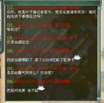 若兮:你好,我是叶子猪记者若兮,受无名邀请来采访关于交易仙器一事!请问能讲下事情经过吗? 白雪:嗯,我的四阶仙器喝醉了,当成二阶仙器卖了4200万DHB! 若兮:听无名说,是卖给霸气财财的吗?然后呢? 白雪:嗯,然后问他要,他不给! |