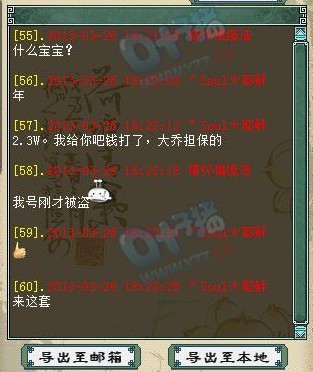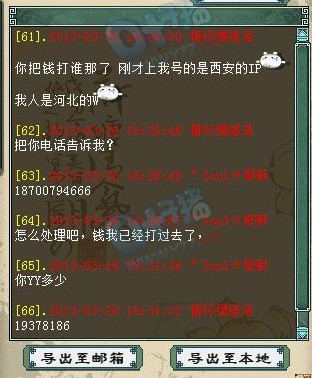 那天我准备跨服出去买年,系统提示不让出去买。后来我在世界上说买年,然后大乔队伍里的队长,情缘浩就M到我,说他想卖年。我说上CBG 2.2W直接交易,后来价钱谈到了2.3W, 到最后他说要线下交易。