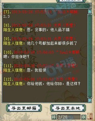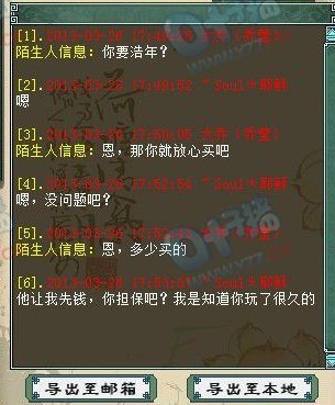 那天我准备跨服出去买年,系统提示不让出去买。后来我在世界上说买年,然后大乔队伍里的队长,情缘浩就M到我,说他想卖年。我说上CBG 2.2W直接交易,后来价钱谈到了2.3W, 到最后他说要线下交易。