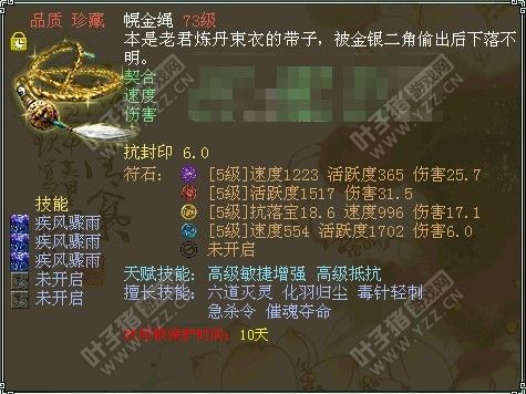 叶子猪记者‖醉红尘 :对于近期5阶仙器和终极技能的大幅度降价你是怎看待的? 一叶◆福天云 :终极技能是被灵宝影响的,疾风骤雨太变态 。 叶子猪记者‖醉红尘 :疾风骤雨,还有新属性定力的加入,你觉得敏队是否受到了空前的打击?对于未来的PK格局你是怎么看的? 能否把灵宝也展示给大家? 一叶◆福天云 :我觉得还是敏队伍有优势,目前来看有优势,但是随着等级增加以后敏队伍的优势就逐渐没了。 叶子猪记者‖醉红尘 :因为最近论坛敏队吐槽的比较多,说说你的看法,敏队的优势在哪里? 你是否会一如既往的坚持敏队? 一叶◆福天云 :当然了,这是必须的 ,我都玩了3年敏队伍了,敏队伍优势还是很多的 ,定力也是有几率的 。 灵宝金箍和幌金绳: |