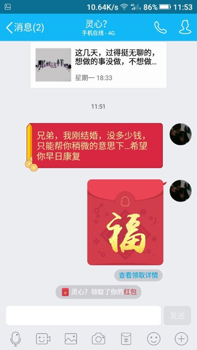 他来自昆仑天池绮楼听风雨帮派,他叫雪忆寒×灵心,帮里的人都喊他骚心,他是一个乐观积极向上的逗比,他在帮派里很受大家欢迎,是大家的开心果。 但不幸的是,2016年2月18日,他被检查出肝部恶性肿瘤,也就是肝癌,因为是晚期,医生说他的生命可能只剩数月。 好在灵心有这么一群好兄弟,和他在游戏中认识了十几年的冰殇,联系到记者,希望能在叶子猪报道此事,为灵心送上祝福。 先来看看灵心的自述: 在记者采访他的各位好兄弟的时候,灵心在群里说话了,此事的他还躺在医院的病榻上,但是从他的语气中能看得出来他并没有被病魔打败,还是积极乐观的面对病魔,面对人生!碍于需要静养,再加上灵心比较害羞,冰没有接受记者的采访,而是自己做了这个事件过程的自述。 自述:我去年年底定期身体检查,做B超的时候,医生叫我去做一下血液检查,而且,叫一定要做一个叫甲胎蛋白的检查。然后,我就去检查了,结果出来,甲胎蛋白>80000!!! 主任医师就怀疑是癌,但不确定(甲胎蛋白>500,就已经和癌打钩了,怀孕的不算!我一个男人,和怀孕有关系,但也不是我怀),就叫我做一个增强CT,确认一下。刚好那时候过年,就没做。 过了年后,正月十六,我到红会医院做了增强CT,就确定是肿瘤了,马上住院,做手术方案。住院期间,我叫冰殇帮我把号清了,做治疗金,就被他知道了,他就发动了好友们来帮我,然后,一群人加了我,给我发红包,关心我,爱护我,开解我,和我聊天打屁,吹牛皮,让我开心,让我放下心中的念想。 灵心的好兄弟冰殇的采访: 叶子猪记者:你好,冰殇,听到灵心这样的消息我也感到很惋惜。 冰殇:你好,小雨,是啊,跟灵心十来年的兄弟了,突然接到这消息,真的很难过#15。 叶子猪记者:都十来年了啊?!大话到现在也才十三年,能在一起玩这么久也真是不容易啊! 冰殇:是啊,一款游戏,一生朋友,这句话,得到的最好的阐述吧! 叶子猪记者:你还记得当初和灵心是怎么认识的吗? 冰殇:十来年了,依稀记得当时我们在一个无名小帮,他是敏魔,一起组队打帮战,然后偶然知道跟他说老乡,果断把他忽悠过来一起玩耍,这一玩,就十来年。 叶子猪记者:原来是老乡啊,那你们从那时候就在现实中认识了吗? 冰殇:没有,是后来知道他也在东莞上班,我也是,离得太近的,就现实认识了。 叶子猪记者:那这是过了多久之后呢? 冰殇:一年左右,当时他打电话给我,然后我们见面认识,再后来我们久不久都会见面,过年回家等等都会一起玩耍,是最要好的兄弟,哥们。人家都说,人的一生,能够遇到一个肝胆相照的兄弟,真的很不容易,我们都很庆幸能够认识,也是因为有大话西游这款游戏,才有我们现在的友情。只可惜,现在我的兄弟躺在医院里…… 叶子猪记者:你们朋友的感情能从线上转到线下真的很难得,很幸运。当时是灵心告诉你他患癌症的吗? 冰殇:是的,他当时知道后,整个人都蒙了,这些事情,不敢跟家里人说,怕父母受不了,想来想去,就先跟我说了。刚听到这消息的时候,真的很不敢相信。 叶子猪记者:所以你其实是第一个知道这个消息的? 冰殇:是的 叶子猪记者:当时得知这个消息后你是有什么想法?或者说你处于什么样的状态? 冰殇:刚听到,我以为他在跟我开玩笑,因为他这个人特别能玩,特别能开玩笑,要不也不会被好多人叫他骚心了。知道后来,听他语气不像是开玩笑。。。自己也蒙了。。。然后立马想到的是必须治疗!治疗这种病不用想也知道花费肯定是一笔天文数字,最近一直为这事苦恼,最后想到了请叶子猪平台报道下,让更多的人知道,或许能有帮助。 叶子猪记者:好的,叶子猪能为灵心的事情出上一份力也是很乐意的。那灵心的诊断结果已经出来了吗? 冰殇:确诊了,肝癌。。。。 叶子猪记者:那当时医生怎么说呢? 冰殇:肝上长了一个11×8cm的肿块,说是原发型肝癌。 叶子猪记者:医生有没有说灵心还能活多久? 冰殇:只说几个月了#15不超过一年#15 叶子猪记者:只有几个月?那这应该是晚期了吧! 冰殇:是的……确诊是晚期了#15 叶子猪记者:那灵心目前处于什么状况呢? 冰殇:医生说他现在不适宜做手术,推荐做介入、化疗,再配合靶向药物多吉美治疗。 叶子猪记者:灵心治疗大概需要多少费用? 冰殇:预计需要40多万,保守估计。 叶子猪记者:这确实不是一个小数目,灵心目前能负担得起这样的费用吗? 冰殇:肯定负担不起,他只是一个普通的打工一族,如何能负担得起这么重的数字#136他父母就是一个普通农民,而且一直在家务农,哥哥是一个做电梯装修的普通装修工,自己还没结婚,40万对于这样的家庭来说,简直就是一笔天文数字啊! 大话是一个情义游戏,40万对于灵心来说是天文数字,但是如果每人能出一点力气,这对于灵心来说,无疑是雪中送炭!所以我们希望能遇到好心人,为这个苦命的家庭,苦命的兄弟伸出援助之手,众志成城,让灵心早日康复! 叶子猪记者:你还有什么想对大家说的吗? 冰殇:好人一生平安!对于帮助、关心灵心的所有朋友,我们铭感于心! 叶子猪记者:好的,小编也祝愿灵心能早日康复! 冰殇:谢谢!相信灵心很快就能康复的! 灵心其他的兄弟采访: 叶子猪记者:你好,怎么称呼你呢? 君子:我叫君子。 叶子猪记者:你好,君子,你和灵心也是游戏中的好友吗? 君子:是的。 叶子猪记者:你和灵心认识多久了? 君子:好多年了,具体多少年,我也记不住。 叶子猪记者:你还记得是怎么认识的吗? 君子:记得啊,我在帮里当管事
