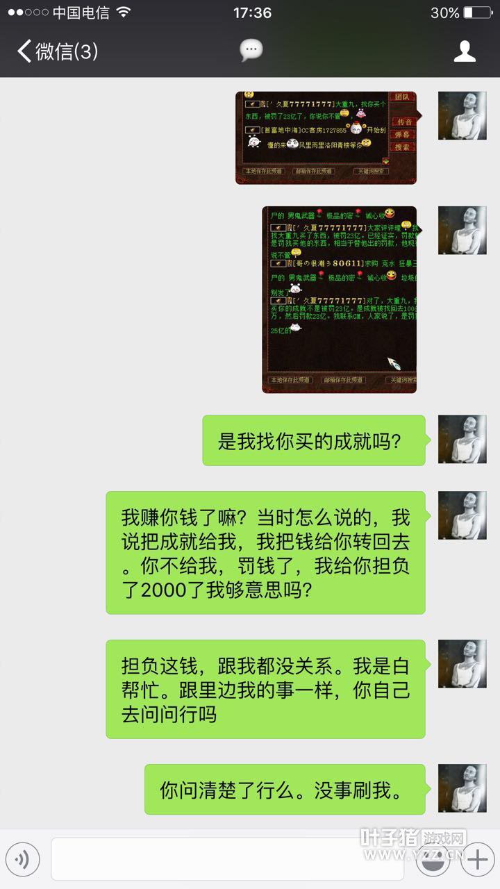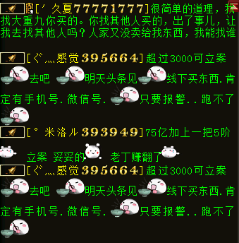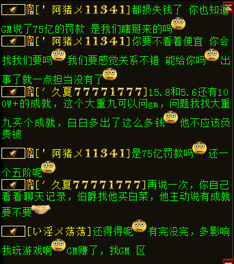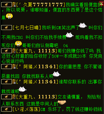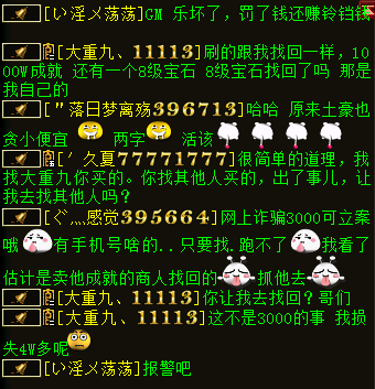 关于线下资讯层出不穷,今天记者要给大家分享一个特殊的案例了,两个顶尖队伍原本关系不错,其中一个找商人线下被骗,导致两个队伍关系破裂。 这次线下涉及近4万现金,事情先简短介绍下,事情发生在服务器一生有你,两个知名队伍分别为久夏/大重九,究竟发生了什么事呢?我们一起来看下。 玩家爆料称近日区内铃铛刷得很厉害,两个顶级队伍的成员互相指责是骗子,记者登录一生有你较晚,铃铛已经刷到后面了,可能玩家会看不太明白内容,有点错中复杂,所以把采访先放到前面,大家再看铃铛就一目了然了。 叶子猪小黑:你好,我是叶子猪记者,有玩家联系我们记者团你们购买东西出了问题,现在在铃铛上相互指认骗子,能否了解下详情? 久夏:从没说他是骗子,只是找他买东西被追回。 叶子猪小黑:买的是谁东西?大重九?(根据铃铛推断) 久夏:对的 叶子猪小黑:买了他什么东西可以具体说下吗? 久夏:不说了,这点事儿上叶子猪还不够丢人呢,其实我就是气他,出了事以后几天不理我。 进入采访 叶子猪小黑:你好,我是叶子猪记者,有玩家联系我们记者团你们购买东西出了问题,现在在铃铛上相互指认骗子,能否了解下详情? 阿猪:其实也没什么,私下买点东西,关系不错的分了分,结果被恶意找回了, 叶子猪小黑:买了多少东西,几个人分了? 阿猪:差不多四万的东西和钱,就我们队伍和猪扒皮队伍分的,截图好多怎么给你? 叶子猪小黑:有QQ吗? 阿猪:你跟大重九说吧,叫他给你,反正图片都有,都在他的手机上。 (于是记者联系大重九聊了会) 叶子猪小黑:这次的交易你有涉及吗?我听大重九说那边是要了1000W成就,相当于5000块钱,结果被找回。 阿猪:那是小数,我们都被罚款了。以前经常叫大重九联系钱的,没出过错,这次被恶意找回了,我们总不能全叫大重九担负吧,所以我们全是自己交的罚款,这次总金额差不多4万呢。帮久夏联系半天钱,大重九当中又没赚钱,出了事,感觉关系不错,给他补助了2000块,还没完没了就想损失全叫大重九出,这样子的朋友能交吗? 下面我们看看本次最大的受害者大重九是怎么说的 进入采访 叶子猪小黑:你好大重九,我是叶子猪记者小黑,能否了解下具体发生什么了? 大重九:我认识的一个商人供货,大话币,一切。一开始4700,4800,5000.最后这一批,说不玩了全出手,5200给我。 叶子猪小黑:意思是有个经常卖你白菜的商人?一共给了你多少大话币? 大重九:这次交易一共给了我4W多的东西吧,是线下,然后找回了。这钱,我们自己的队友都有要,然后伯爵找我要白菜。 叶子猪小黑:你说的伯爵是猪扒皮吗? 大重九:他是猪扒皮的带练,久夏是他们一个队的。伯爵找我要白菜,我说换成成就了,给了他1000W成就,按5200的比例给了他们,我又没赚钱,还自己收好成就给他们的,谁知道被这商人找回了。当时没扣久夏的时候我就找久夏了,让他把成就给我,我把钱给他转回去。他说不用。有可能GM察觉什么了,晚上久夏就找我了,说罚款15.6Y。可是他找我,我能说什么? 叶子猪小黑:稍等下,这个商人和你合作多久了?这次最后跟你合作是什么时间? 大重九:3个月了,最后一次是7月中旬吧。久夏说我人不错,朋友之间么,能解决就解决,当时我就给他转过去2000块钱。谁知道后面他们又被处罚了5.6Y,他又找我,我出差没回他信息,他就开始刷我。 叶子猪小黑:是和商人交易的东西全部被找回了吗? 大重九:对啊,5阶,75Y大话币,加起来差不多4万现金吧,现在闹成这样了。 叶子猪小黑:久夏刷铃铛找你要了哪些?例如说1000W成就相当于多少钱? 大重九:25Y左右,5000块。 叶子猪小黑:他们花了5000块现金在你这拿了1000W成就,然后成就被商人找回?所以铃铛刷你要你赔? 大重九:5200,还有一个8级石头1W,一共15200,8级石头是我自己的。 叶子猪小黑:8J石头没出问题吧? 大重九:那是我的,肯定没问题,我自己合的。这个事我损失最大,我给队友们担负了罚款,给久夏担负了2000块,我里里外外赔双份。 叶子猪小黑:久夏那边5200,你给了2000,他们就刷你,希望你全额承担是吧? 大重九:嗯,他们被处罚了15.6Y+5.6Y大话币,我担负了10Y大话币。 叶子猪小黑:那成就被没收了没? 大重九:不清楚。 叶子猪小黑:哥们,发生这种事我挺能理解的,刚才和你的队友阿猪聊了下,你的队友都挺能体谅你的,毕竟你也是受害者,事情既然发生了你打算怎么解决? 大重九:都这样了能解决什么,杀杀杀呗。能用武力解决就不愿意吵吵了,没借过。 叶子猪小黑:经过这样的事你还会线下交易吗? 接下来大重九提供了相应的截图 久夏问大重九的白菜是否被找回