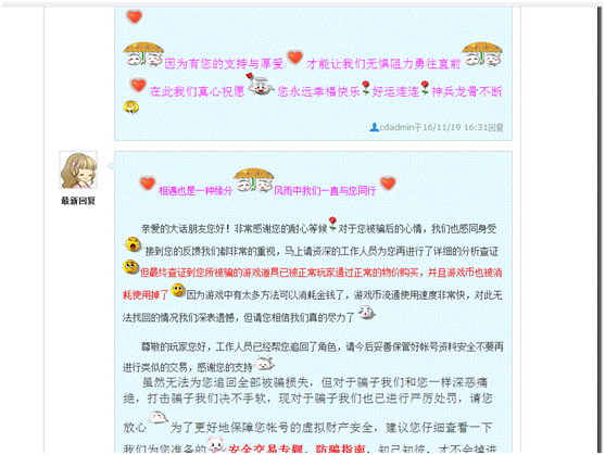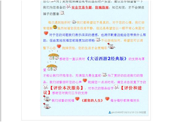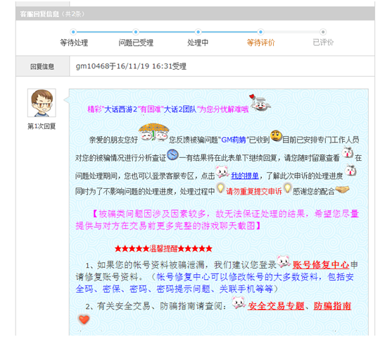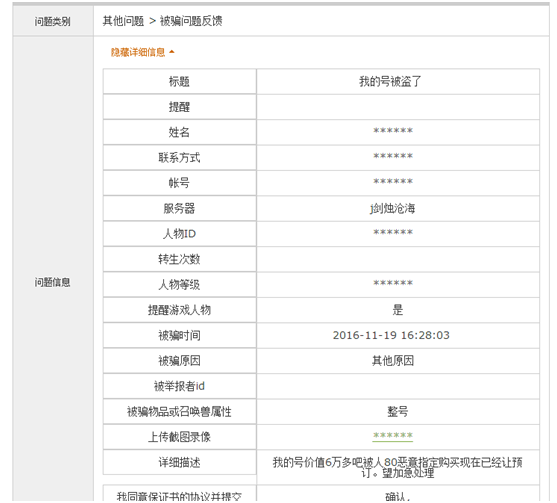 注意,是50000仙玉,相当于人民币5000元哦!玩家怎会受如此之重的处罚?另外也是给大家揭露一个骗局,前方高能预警!下面我们来了解下究竟发生什么事了! 正式采访 叶子猪如烟:你刚才说的我没听明白,是你挂藏宝被盗,还是被盗号的挂藏宝了? 莪、演绎完美:是我的号一直在藏宝阁上!由于没卖出去我自己上来挂机卖点东西!可是后来让骗子联系中了木马,在上藏宝的过程中被骗子用远程把价格从64000元改为了80元,并且指定了他的小号,我当时还有24小时的公示期!因为下架不超过7天随时上架。 叶子猪如烟:这个过程你能详细说下吗? 怎么会被人远程改了? 莪、演绎完美:我在摆摊!上面写的清号!骗子加我好友问我整体卖么?我说卖!我说这走藏宝阁!他说行呢先给他看看物资!后来要上我号,我的号是有IP绑定的!所以就给他扫了二维码!(就因为扫码我+了QQ)联系我的时候是在大话游戏里。后来给我说他卡里就有58000多。 叶子猪如烟:对方这么做只是为了让你更相信他的话吧? 莪、演绎完美:对,就是要让我相信他有能力买这个号,当时他发了个图片的,可是马上他取消了,开始改语音说话。 叶子猪如烟:你当时在藏宝阁上挂的价格是多少? 莪、演绎完美:我的号一直都挂的是63000元最后改的61000元。 叶子猪如烟:你让他扫了你大话二维码后 ,当时就出问题了吗? 莪、演绎完美:当时没出问题,后来他说行了你顶号吧我们商量下价格!他算了算差不多值6万!我说号也白送了!他说那你现在指定我把!我就指定了他的号!他是3转160多级的号!但是后来他说指定个零级的号吧!要不这个仓库号不能用了!我又在网页改指定但是改不了了!他说就怕这样!别到时候指定不了!我刷新了下指定他(他在这期间就是为了用小号收藏我的号)我刚打开网站上去指定的时候电脑就不知道怎么了黑屏了下!我重新启动了下电脑(10秒钟吧)上去一看已经让人预定了!还是80!预定完了不能下架他还给全款付了,我知道这出问题了直接给客服打电话还报警了!后来4点多网易客服给我的答复是号已经找回来!对方的钱已经退回对方交易的银行了,我又给刑警队打电话撤销的案件。 叶子猪如烟:现实报案的那个你有拍下来吗? 莪、演绎完美:报案的没有!因为当时我不确定网易能不能找回来!所以刑警说要是通知我找不回来才会立案。不过我有客服申诉的图片,我给你。 玩家边报警边联系客服申诉