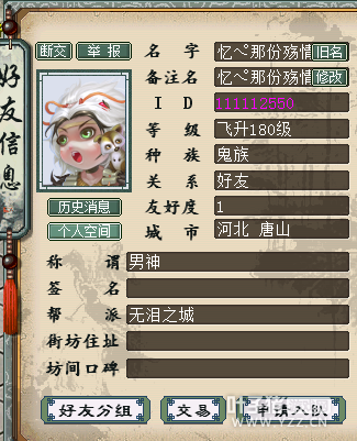 叶子猪小学生:你好,我看到你是和帮主都是一个地方的,可以聊聊你眼中的他是怎样的形象吗? 882●:嗯嗯,生活中,大话中,我们都相识,相知。帮主在游戏中,是个仗义、大哥哥形象,有威信。 叶子猪小学生:你们在一个地方,一起玩的机会很多吧。 882●:我们同在济南,少不了的就是一起撸串,别误会,是吃烧烤。现实生活中,自恋、山东人的豪爽都是一流,但是也有那么一点点闷骚#23 叶子猪小学生:好的,谢谢接受采访。 采访对象2:忆ペ那份殇情 采访对象2