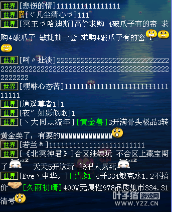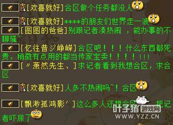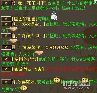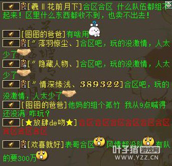 叶子猪吕轻侯:我看了下,这个区一直没有太大存在感 爷々依旧疯骚:一生所爱8年了也比这区强。 『为祢葑心』:是啊, 可以吧几个死区合起来也总比现在好吧? 疾风:人都跑光了。 羽墨ぃ春天:玩得真没劲. 窈窕淑女々倩:这区每天见的来来回回总是那几个人o(╯□╰)o 羲‖情义无双:不要聊和合区没关系的事情,听到没有,局部? 局部有雨:明白了,区里没人东西也卖不出去啊。 羽墨ぃ春天:没劲没劲.区里没人气,没意思。 窈窕淑女々倩:再不合区商人都跑了...... 欢喜就好:合不合得看表哥 『为祢葑心』:组了6天22.半小时才组到一个秘境队伍 我去杀秘境了 赶紧合区吧 ,组队 ,组不到! 羲‖情义无双:去集市看看,到底有几个人在摆摊?几个是商人?几个是玩家?集市总共摆摊的人不到30个。 梦づ锦瑟华年:你看看长安摆摊的 ,长安当铺前面摆摊和洛阳集市的,多冷清。 宿命え十二少:只要点卡能便宜就合吧。 窈窕淑女々倩:30个摆摊的,29个商人摊,1个五开党的摊。 羽墨ぃ春天:求合区 !求对手! 羲‖情义无双:求合区,就算被虐也要合区!每次合区都没有花前月下? 三国是五只狗:就是就是,我们跟后娘养的一样。 梦づ锦瑟华年:为啥每次合区都没有花前月下? 疾风:合区有人带练级, 赶紧的。 羲‖情义无双:为什么每次合区都没有花前月下?