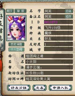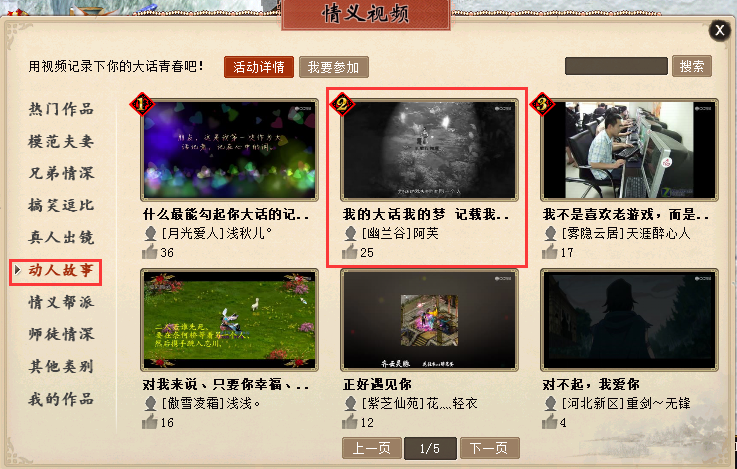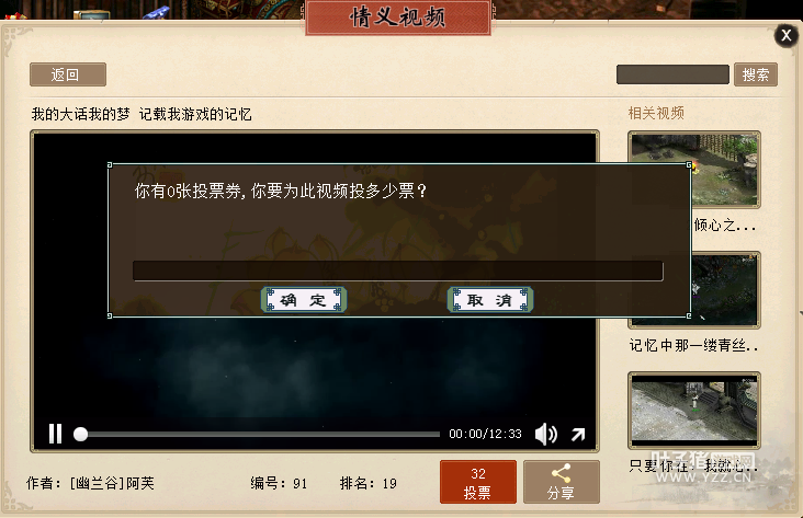 叶子猪小黑:我看了不少参赛视频,能否聊聊你视频的制作故事吗? 阿芙:在没有出这个视频比赛之前,我就有开始动手做视频想纪念自己的大话故事。每个玩家都有自己的青春回忆,我想为自己保留这份记忆。当时我的一个朋友给我发了一条连接,说有视频比赛,我就拿这个视频参赛了。 叶子猪小黑:我也觉得这个比赛挺适合你,毕竟你也做过那么多视频,你对自己的比赛是否有期待? 阿芙:参加了肯定会有期待,主要希望能挂上大话青春制片人那个称谓吧,我的故事,只是作为平凡玩家群当中一个微不足道的故事,我听到不少玩家在讲他们的游戏遭遇,很感动,也希望他们也能够把自己的故事做成视频来参加这个比赛。 叶子猪小黑:看来你很喜欢与大家一起分享。 阿芙:是的,毕竟我们玩游戏很久,我觉得能够坚持这款游戏的都是比较有情义的玩家,大家需要多交流,很多玩家的故事是可以产生共鸣的。 叶子猪小黑:聊到视频制作,你也做过2年了吧?可以聊聊你为什么喜欢做视频吗? 阿芙:很早大话西游2是有FLASH专区的,我同学喜欢来我家玩,我播放那些玩家做的FLASH给她们看,我记得其中一个FLASH讲述的是一个逍遥生与一个剑侠客的兄弟情,背景音乐是张信哲的《白月光》,故事里逍遥生慢慢变坏与剑侠客生死之战,看的我和同学泪流满面。我同学对我说她们一定要来玩大话。那时关于游戏的FLASH真的很棒,他们是大神,我多年来直至现在最崇拜之一的就是雪晶飞恋。我不会做FLASH,接触视频软件后就想着平常也只会截截图或者用文字记录游戏相关的东西,所以就想着用视频软件来录制游戏画面。 叶子猪小黑:现在会做FLASH视频的玩家貌似不多了? 阿芙:有的,这次参赛有两个做FLASH的朋友,我一直没机会找他们偷师,通过视频去感受大家对游戏的热爱,爱这款游戏的朋友太多了。 叶子猪小黑:那你对视频结果有没有信心? 阿芙:这个……只能说听天由命吧。 叶子猪小黑:怎么会这么想?是因为目前的视频人气和投票关系吗? 阿芙:对。 叶子猪小黑:我看你的人气2.1万排在前5也是相当不错的,那么投票呢? 阿芙:在游戏的视频票数寥寥无几。 叶子猪小黑:我在游戏看了下票数,第一名的票很多,投票是玩家在任务练级时获得投票道具进行投票的,对吗? 维护后一小时内第一名的票数和后面的票数拉锯战很大