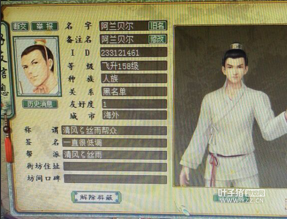 今天有个玩家联系了叶子猪,表示在他们区发生一件非常恶劣的事,影响了女玩家正常游戏,对方简直就是一个变态。 更多的是因为该事件造成不少吃瓜玩家奚落受害女玩家,甚至用了很多恶意的字眼,这无疑是更深的伤害。 到底发生了什么事?该玩家先透露了下经过: “紫芝仙苑有个女玩家,叫紫晴,被人恶意刷世界,刷她世界的人叫阿兰贝尔,是两年前紫晴移民回紫芝的时候认识的,后来紫晴拉他黑名单,一直没联系了,这两天那人回来玩,M紫晴,紫晴没理他,他就开始刷世界说想操紫晴,还在网上找了一些裸女的图片,发在自己的空间,并把空间发到世界上,说这是紫晴的裸体照,世界上好多人就加了紫晴,有骂她是鸡的,说了好多难听的话,她实在受不了被人这样抵毁,就想找记者帮她澄清下” 经过玩家的爆料,叶子猪记者联系到了该受害女玩家紫晴,来了解下这几天来她的遭遇! 受害人:紫晴 【采访语录】 叶子猪记者:紫晴你好,刚才你朋友联系我们叶子猪记者团说了你的遭遇,我想进一步了解下什么情况,是否方便说下? 紫晴:方便的,你可以问。 叶子猪记者:骚扰你的玩家现在是否在线? 紫晴:他一般都是晚上在线,ID233121461 紫晴提供阿兰贝尔的资料