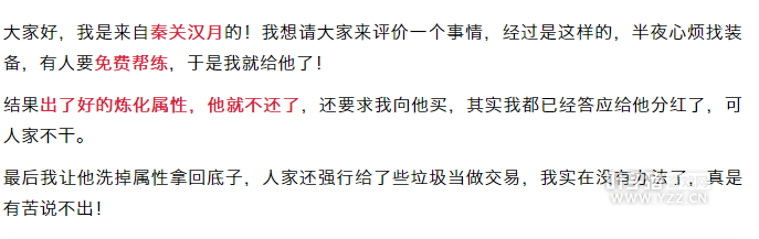 今天做的一个报道比较特殊性,牵涉诈骗,之所以说特殊,是事件本应该没有骗子,结果双方都被指控为骗子,然后可能就真的成骗子? 案子说的好像有点绕了,那么到底发生什么事了?联系叶子猪记者团的玩家表示自己可能是被合伙骗了现在还被当骗子,最可恨的是造成财产损失不说,还被上了网抨击是骗子。 在当事人叙说自己的倒霉经历前,记者先去网上了解了下让当事人变成骗子的文章,以下为当事人被骗沦为骗子的文章内容! 某玩家文章截图 一个来自秦关汉月的玩家爆料有玩家(联系叶子猪记者团的当事人)免费帮炼化属性然后不归还,要分红最后强行给垃圾交易,当然这也是一方之词了,特此叶子猪记者团梳理下此事。 服务器:秦关汉月 当事人:黑色毛衣,我炼化被几率买下你装备被你找回还骂我是骗子? 装备主人: 美啦啦七小姐/萌萌哒小丸子,强迫我分红强行给垃圾交易,你是骗子。 下面看看当事人黑色毛衣来叙述下事情整个经过 事情是16号凌晨2点10分左右发生的, 美啦啦七小姐世界买衣服秘籍,我说我帮炼化只帮30次,他丢给我一件男魔抗水37的衣服,说要出克火才就行。在我点了第二下就出了敏捷36,衣服可以说价值连成了我就找他分红, 美啦啦七小姐他说卖掉才给我分红,我不认识他,他发了一个叫小丸子队友的5阶给我。 因为 美啦啦七小姐开了一队号,我问他是不是5阶本人(萌萌哒小丸子),他说是,让我先把衣服给他,我怕他不给我分红,他就说要是不相信他就把衣服洗掉,我觉得这个属性洗掉很可惜,毕竟几率了,本身挺高兴的一件事情。 我说你要卖的话就卖给我吧,他说让我给700现金,我搞价说500,他就让我支付宝给他转钱,我在转钱的时候发现不是小丸子,他就说小丸子是他队伍的号,他可以代表一切,让我加他微信看了他的网易宝和藏宝阁交易记录,还有银行卡绑定。 我还是没敢转,我就说游戏里给你吧,就给了4开吉人誓死抗仙法20满龙骨和丸子的果子加一个垫底神兵和3000W现金,我当时身上现金不够是临时卖点卡给的,我还发了一张14级双忽冰98资质已经升到11级的星卡给他选择,他说他正好小号要果子,就选了果子垫子和3000W。 之后我俩微信还唠了几句闲话嗑,当时都3点多了吧,然后大家就睡觉了 结果16号早上10点半左右萌萌哒小丸子上线让我现在把装备还给他,我说我买的,你让 美啦啦七小姐联系我。他就说联系GM要找回装备,一直刷铃铛骂我,我不想多事。 我铃铛回他要不来擂台,我洗掉属性还给你,他就一直世界和铃铛刷我,这个萌萌哒小丸子一定要找回,我就说让 美啦啦七小姐出来,谈个处理结果什么的, 美啦啦七小姐一直也不给我回话。 下午2点40左右我上号,装备被找回,可是我的果子垫子和游戏币也没有退给我,我联系美啦啦七小姐也联系不上,不知道怎么回事,我无奈只能自己去申诉我所交易的果子垫子和神兵,成功找回了,我就想着算了,就当没这回事吧。 17号下午2点多萌萌哒又在铃铛刷我,并且空间发了一张找回并且保留我炼化36敏属性的图,我就纳闷了,我知道帮忙炼化可以找回,但是绝对是还原属性的。 我去找客服申诉,客服给我回话居然说我购买的那件装备是被盗装备,属性保留,我就纳闷了,他本人登录怎么可以申诉盗号找回,如果我当时支付宝给赚了钱,岂不是他找回装备还骗我500块? |