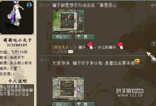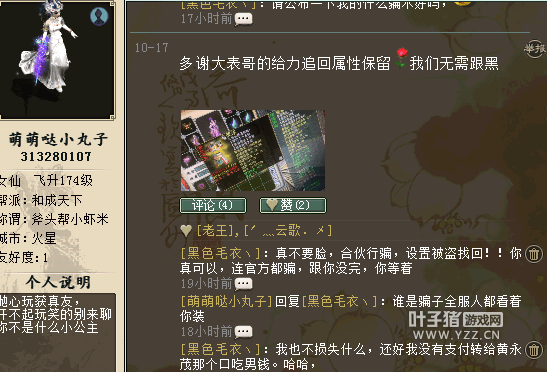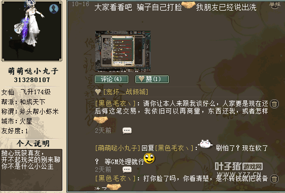 今天做的一个报道比较特殊性,牵涉诈骗,之所以说特殊,是事件本应该没有骗子,结果双方都被指控为骗子,然后可能就真的成骗子? 案子说的好像有点绕了,那么到底发生什么事了?联系叶子猪记者团的玩家表示自己可能是被合伙骗了现在还被当骗子,最可恨的是造成财产损失不说,还被上了网抨击是骗子。 在当事人叙说自己的倒霉经历前,记者先去网上了解了下让当事人变成骗子的文章,以下为当事人被骗沦为骗子的文章内容! 某玩家文章截图 一个来自秦关汉月的玩家爆料有玩家(联系叶子猪记者团的当事人)免费帮炼化属性然后不归还,要分红最后强行给垃圾交易,当然这也是一方之词了,特此叶子猪记者团梳理下此事。 服务器:秦关汉月 当事人:黑色毛衣,我炼化被几率买下你装备被你找回还骂我是骗子? 装备主人: 美啦啦七小姐/萌萌哒小丸子,强迫我分红强行给垃圾交易,你是骗子。 下面看看当事人黑色毛衣来叙述下事情整个经过 事情是16号凌晨2点10分左右发生的, 美啦啦七小姐世界买衣服秘籍,我说我帮炼化只帮30次,他丢给我一件男魔抗水37的衣服,说要出克火才就行。在我点了第二下就出了敏捷36,衣服可以说价值连成了我就找他分红, 美啦啦七小姐他说卖掉才给我分红,我不认识他,他发了一个叫小丸子队友的5阶给我。 因为 美啦啦七小姐开了一队号,我问他是不是5阶本人(萌萌哒小丸子),他说是,让我先把衣服给他,我怕他不给我分红,他就说要是不相信他就把衣服洗掉,我觉得这个属性洗掉很可惜,毕竟几率了,本身挺高兴的一件事情。 我说你要卖的话就卖给我吧,他说让我给700现金,我搞价说500,他就让我支付宝给他转钱,我在转钱的时候发现不是小丸子,他就说小丸子是他队伍的号,他可以代表一切,让我加他微信看了他的网易宝和藏宝阁交易记录,还有银行卡绑定。 我还是没敢转,我就说游戏里给你吧,就给了4开吉人誓死抗仙法20满龙骨和丸子的果子加一个垫底神兵和3000W现金,我当时身上现金不够是临时卖点卡给的,我还发了一张14级双忽冰98资质已经升到11级的星卡给他选择,他说他正好小号要果子,就选了果子垫子和3000W。 之后我俩微信还唠了几句闲话嗑,当时都3点多了吧,然后大家就睡觉了 结果16号早上10点半左右萌萌哒小丸子上线让我现在把装备还给他,我说我买的,你让 美啦啦七小姐联系我。他就说联系GM要找回装备,一直刷铃铛骂我,我不想多事。 我铃铛回他要不来擂台,我洗掉属性还给你,他就一直世界和铃铛刷我,这个萌萌哒小丸子一定要找回,我就说让 美啦啦七小姐出来,谈个处理结果什么的, 美啦啦七小姐一直也不给我回话。 下午2点40左右我上号,装备被找回,可是我的果子垫子和游戏币也没有退给我,我联系美啦啦七小姐也联系不上,不知道怎么回事,我无奈只能自己去申诉我所交易的果子垫子和神兵,成功找回了,我就想着算了,就当没这回事吧。 17号下午2点多萌萌哒又在铃铛刷我,并且空间发了一张找回并且保留我炼化36敏属性的图,我就纳闷了,我知道帮忙炼化可以找回,但是绝对是还原属性的。 我去找客服申诉,客服给我回话居然说我购买的那件装备是被盗装备,属性保留,我就纳闷了,他本人登录怎么可以申诉盗号找回,如果我当时支付宝给赚了钱,岂不是他找回装备还骗我500块? 当事人说到这里,记者和他简短聊几句 叶子猪记者:你好,你的委屈我看到了,刚大致看了下你提供的截图对话,需要提几个问题。(玩家提供的截图会在结尾上传) 黑色毛衣:好的,记者你问吧,他故意网上抹黑我,我才来叶子猪求助的。 叶子猪记者:你帮对方免费炼化要求分红,信不过对方又想买下来,交易之后结果对方不但一直刷你骗子找回了装备还让你上了网被当骗子,对吧? 黑色毛衣:是的。 叶子猪记者:你说一直刷你的是萌萌哒小丸子,那么 美啦啦七小姐呢?这衣服到底是萌萌哒小丸子的?还是美美哒七小姐的? 黑色毛衣:给我衣服和材料炼化的是 美啦啦七小姐,他一开始还说他是小丸子本人,转账时发现他不是小丸子他又改口说是一个队伍的,我不放心才会游戏跟他交易,没想到萌萌哒小丸子后来会一直刷我,而 美啦啦七小姐不吭声了,我微信和游戏找 美啦啦七小姐都不说话。 叶子猪记者:你最后游戏交易给的东西都是给了美啦啦七小姐对吗?萌萌哒小丸子是否知情? 黑色毛衣:知情。 美啦啦七小姐没骂我也不出面。 叶子猪记者:那为什么萌萌哒小丸子为什么一直追着刷你? 黑色毛衣:这个问题我也不是很明白,所以说萌萌哒小丸子不仅是污蔑,完全是抹黑我,还把这事发到网上,刚开始好多玩家骂我,朋友告诉我后我自己也留言解释了一下。 叶子猪记者:如果是以玩家的角度来看,你之前跟人家说免费炼化,最后却索取分红,一开始不归还对方衣服,显得有些不太厚道。 黑色毛衣:我就错在这里,但我不是骗子。 叶子猪记者:问个问题,如果对方不肯分红,你是否不归还装备了? 黑色毛衣:那是不可能的,再说炼化装备会被对方找回的,这是傻子都知道的事,聊天记录都在那里,我说卖给我他都直接开了价钱的。 叶子猪记者:我这是假设,如果对方不分红也不开价,你是否会归还?还是只是想分红先卡卡对方,但没想过把衣服占为己有? 黑色毛衣:无奈就只能归还对方,我怎么可能拿走对方装备对不对,只是想为自己争取一点利益。 叶子猪记者:你先是打算转账,发现美美哒七小姐并不是