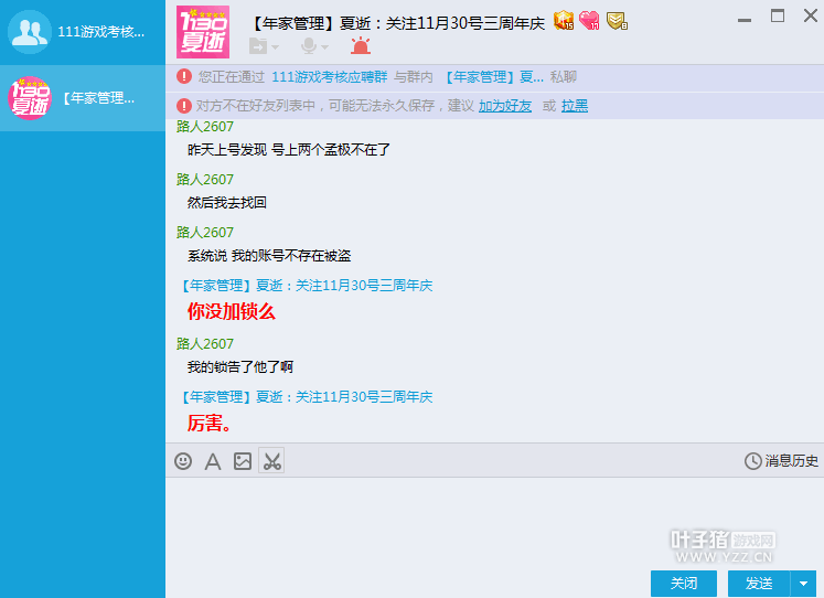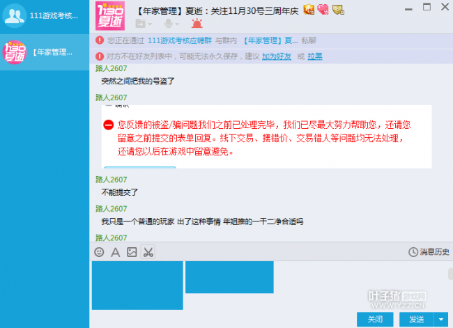 受害者求助叶子猪,下面来自叶子猪小黑的报道 叶子猪小黑:你好,你丢失两只孟极找不回来客服是如何回复你的?能否提供下完整截图? 说不透这宿命:我丢失孟极的两个号提交损失孟极信息,10月份我没有太多时间玩,但是不想把号落下,就在年姐公会找个代理,结果客服说没有存在被盗的情况。 叶子猪小黑:你的孟极没有上锁吗? 说不透这宿命:我把物品锁告诉对方了。 叶子猪小黑:你找代理难道号不绑定电脑的? 说不透这宿命:我也怕请到骗子,才特意去公会找代理,觉得年姐公会很大吧不会骗我的。没想到会这样,公会不承担责任。 叶子猪小黑:你是怎么发现孟极丢失的? 说不透这宿命:我11月5号还上过号的,孟极当时还在,之后现实有个朋友想买我的号,8号的时候朋友和我一起去了网吧,朋友开我号看发现我的孟极不见了。 叶子猪小黑:也就是说孟极是在5-8号之间丢失的对吧,你孟极不上时间锁也不绑定电脑,这不明摆着给别人送东西吗?现在出这个问题,你自己也需要承担很大的责任,我真的又气骗子又想指责你。 说不透这宿命:我没有防范那么多,出于对年姐工会的信任吧,是我太天真,既然公会允许他接代理我又给了钱,那就说明我们是雇佣关系,虽然没有合同。 年姐公会的代理年家老A