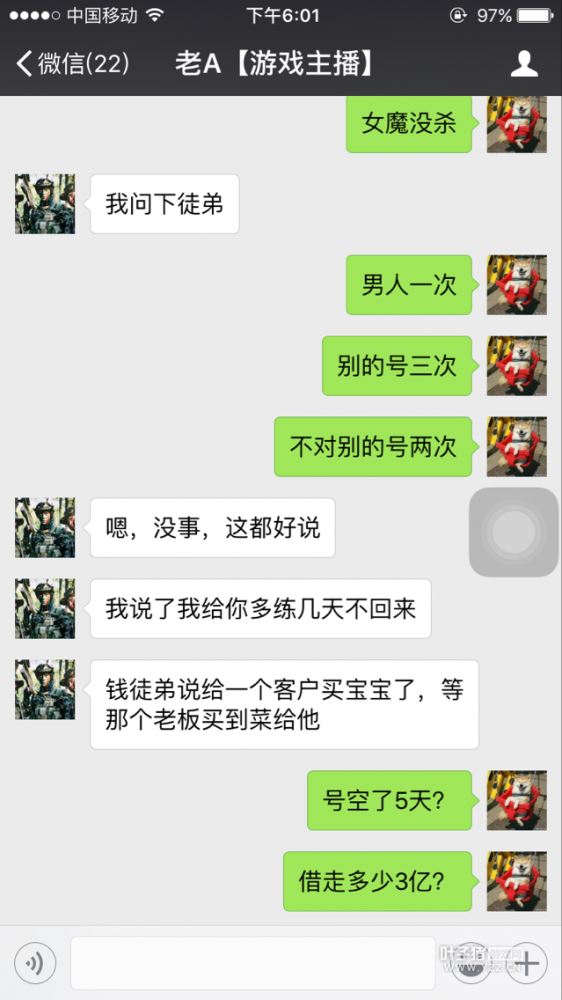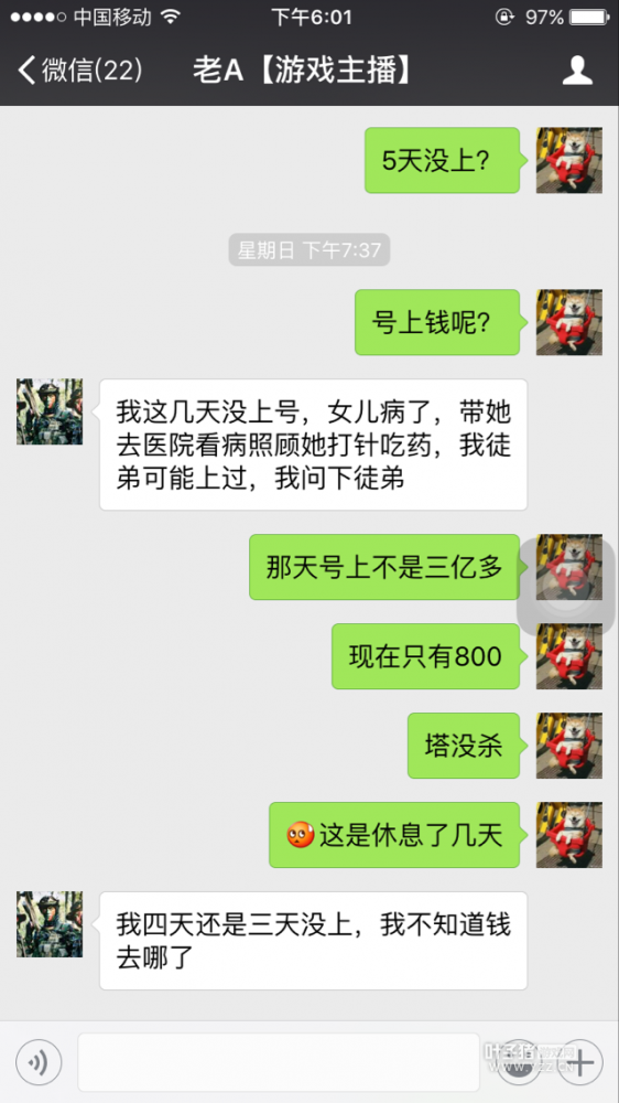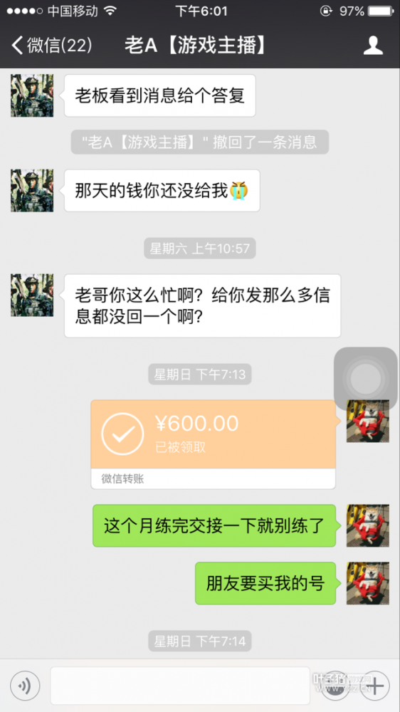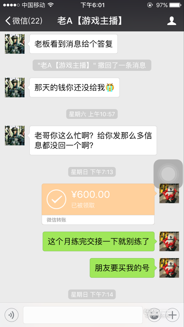 叶子猪小黑:请问你的钱是通过公会还是私下直接给这个老A? 说不透这宿命:私下微信给老A 叶子猪小黑:那这算什么保障?钱又没经过公会,别说公会,CC30都出一堆骗子,你们这些玩家到底是怎么想的? 说不透这宿命:我真的没想那么多,给你看下以前孟极的记录,现在是4开信土高分的。 叶子猪小黑:你损失我也着急,你是否还有联系过客服? 说不透这宿命:我给客服打电话还是说没什么问题。 叶子猪小黑:我看了些你与老A的微信截图对话,里面有个600转账是什么意思?(截图后面提供) 说不透这宿命:他帮我买了3E游戏币,5号我上号发现3E游戏币被他转移走了,我问他游戏币怎么没了为什么日常没做,他给了一些解释,我就信他了,我没想到8号再上号会发生这样的事。 叶子猪小黑:等于损失3E游戏币和2只孟极对吧?其他号都没损失? 说不透这宿命:我其他的东西都有移民锁,所以卖号也只能卖给我现实的朋友。 叶子猪小黑:我真……不知道说你什么好,希望客服能够重新调查下你帐号损失的问题。 说不透这宿命:麻烦你了。 叶子猪小黑:最后你有什么想说的吗? 说不透这宿命:对于年姐不负责任我很失望,我想说年姐你的代理是这样的吗?先练号在给钱?我相信谁的代理也不会先练号在给钱吧?最后我想说认证主播也不一定安全,希望大家自己注意点! 尾音: 如果玩家给宝宝上时间锁或者绑定电脑,根本不会让骗子有机可趁,网易也一直强调玩家一定要妥善管理好自己的帐号,不要随便分享,骗子固然可恨,可是受害人自身也是有责任的,不是你这种盲目的信任又怎能助长骗子的横行? 在此也给各位玩家敲响警钟,不要相信所谓的主播,报导被主播欺诈的案例又何止一两桩?你们既然随意分享号分享物品锁,就要为自己的损失负责。 受害人已经如此,在此肯定客服重新调查下数据,能帮助受害人挽回损失。 以下为受害者提供的相关截图: 联系年姐公会的人对话截图