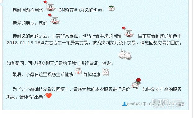 昨天有玩家联系记者表示自己被客服判线下交易受到系统处罚,问题是他只是向朋友借钱了,现在甚至牵连借钱的朋友也受处罚。 玩家甚至说客服回应即使是借钱也是无偿交易属线下交易?这点就有点纳闷了,下面记者与该玩家连线,看看具体是怎么回事。 受到处罚的当事人:蓦然回首 【简短采访】 蓦然回首:是记者吗?我要爆料GM无缘无故说人线下交易,我有截图。 叶子猪小黑:线下交易客服肯定有依据才会对你进行处罚,而且线下我这边没有数据无法判断你是否存在这种行为,建议你再找客服重新查下。 蓦然回首:我给你截图 我昨天下午4点借钱 今天还钱 不是一次两次了 都知道这事情的 叶子猪小黑:借钱给你的朋友是彼岸流年? 蓦然回首:是的,这是借钱给我受到处罚的好友资料。 借钱反而受到处罚的好友:彼岸流年