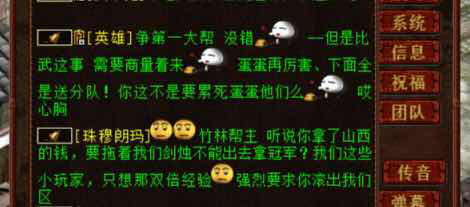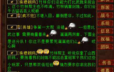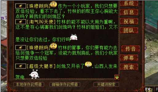 有人的地方就有江湖,有江湖的地方就有恩怨。 作为江湖中顶尖的服务器,曾有传言云:天下乱,剑烛沧海不能乱! 但就在一夜之间,坊间传闻剑烛沧海的第一大帮和第二大帮打起来了! 今天各种跟大话西游2沾边的平台都被剑烛沧海的铃铛和厮杀霸屏了。一时间,QQ群,微信群,各个服务器的聊天内容,都聚焦在剑烛沧海这个老牌强服! 相信少数人人也了解了这起纷争的原因,绝大部分的玩家都是云里雾里不明所以。 是非公断,我们没法下结论。就一起来看看记者带回的传音信息: |