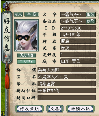 叶子猪记者近日采访到了齐云灵脉第一大帮的帮主——霸气哥,这位大神级玩家除了讲述率领第一大帮的感受外,同时也有招募新成员加入的意向,下面就来看看本次采访内容! 叶子猪吕轻侯:霸气哥晚上好#23齐云第一大帮的帮主能接受采访,小侯很荣幸了哦~ ~霸气哥~:哈哈 晚上好#23~荣幸不至于,我只是齐云灵脉的一员~ 叶子猪吕轻侯:霸气哥说话倒是很低调嘛.最近帮派发展还好吧?另外我有个小小的想法:第一大帮的帮主队伍是什么个队形呢?可以透漏下吗? ~霸气哥~:发展的挺好,大家在一起还是比较融洽,不管是新移民来的还是以前老人#23比较尴尬的是我是没有组队#23重心放在管理上#83主抓比武队伍和帮派的队伍#121 叶子猪吕轻侯:那应该挺忙的咯,我所认识的大帮帮主,各个都是日理万机,帮派的各种事项都得惦记着,目前帮派队伍都发展的怎么样? ~霸气哥~:帮派现在比武队伍 一个不带回血36化的血队伍向招聘一名六套10化左右的回血鬼,队伍现在六套11化女魔。双六套15化男人。双六套10化霄汉,双六套三把武器的大炮炼器都是狂暴20左右的#23 叶子猪吕轻侯:这是标准土豪队哦,能给看看部分物资解解馋么?另外对于回血鬼的要求除了六套十化,其他的还有没有什么要补充呢? ~霸气哥~:下面我给你发图#23主要是细节包括装备的搭配#23我们有专业的搭配人员给您出具数据,包括物资的价格、种类、也会帮助搭配,指挥也是很给力的#49队伍气氛相当融洽,能开的起玩笑能一起逗比最好#93 |