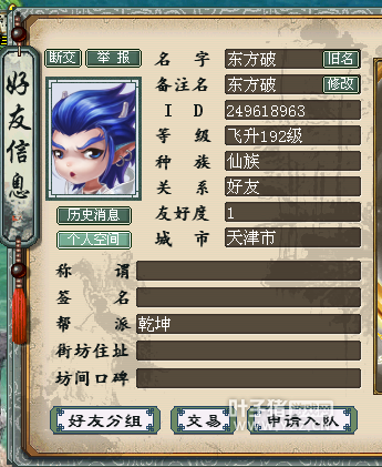 【采访语录】 叶子猪吕轻侯:你好#23东方破,方便现在聊聊吗? 东方破:你也好#23可以的我现在不忙. 叶子猪吕轻侯:嗯嗯,听仙子说您是时隔多年刚重新回归的老玩家啊? 东方破:是啊,强总盛情难却,也是多年的老朋友了. 叶子猪吕轻侯:你和如风还有强总,认识多久了? 东方破:水晶02年开区基本就认识了,虽然中间隔断了几年没玩,但是感情犹在#89仿佛就是昨天的事情. 叶子猪吕轻侯:你们仨不是一个地方的吧?离开大话,你们靠什么维系大话里产生的友情呢? 东方破:嗯,不是一个地方的。你要说感情产生地,那就是乾坤(水晶宫十几年的老牌强帮,至今屹立不倒)了,乾坤帮派从大话开始延续至今仍在,你就知道我们这群人是如何看待游戏和情感的. 叶子猪吕轻侯:当时为什么离开了大话离开了水晶宫和乾坤呢? 东方破:因为工作,因为家庭,呵呵,我觉得这是每个人都必须经历的#63 叶子猪吕轻侯:我所知道的很多玩家,都是始于学生时代,终于工作和婚姻.再次入坑也基本是工作稳定婚姻幸福有了孩子票子车子之后,突然想弥补年轻时的遗憾.,于是才重拾大话再续西游? 东方破:当然,事业稳定,家庭和睦,十几年的大话情怀,总有几分牵挂#23 叶子猪吕轻侯:突然想起一首断情笔#24那么这次回来,哥几个准备干点啥? 东方破:呵呵,怀怀旧,虽说水晶不如以前那么有激情人多,但这里总有我们值得回忆的地方#63游戏一阵子,感情一辈子,这就是游戏带给我们的东西#23 叶子猪吕轻侯:那么只要大话不倒,情义依旧,万一那天游戏没有了,但是感情还在,好朋友是一辈子的事,这次准备甩开膀子好好继续书写未完的友情,你好久不玩了,号这个等级也是相当高的级别了,买的号还是当年的号啊? 东方破:呵呵,当然是买的号了,虽说有时间玩,但是时间也是有限的啊,但是游戏带给我们的情感一直很纯、很真,所以我们又回来了. 叶子猪吕轻侯:多年以前你也叫东方破吗?还是现在新改的名字啊? 东方破:以前就叫东方破,还好这名字一直还在. 叶子猪吕轻侯:很霸气的名字,适合男仙,手一挥死一堆的那种犀利霸气,叫这个名字很合适.现在号打造的怎么样啦? 东方破:PK是2800的敏霄汉,有敏有伤害,还好吧,伍现在也很成型,帮战、天梯玩的很有意思,发一部分吧,其他就一些战术宝宝…… 东方破的宝宝