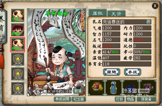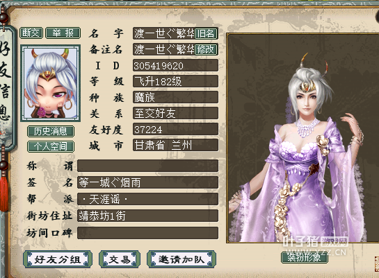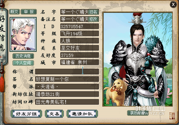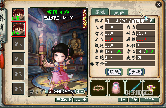叶子猪记者:08年因为媳妇不让玩的关系#35后来又批准了吗12年到现在也差不多8年了哦 等一个晴天:这个是私人问题,能不能不回答 -_-|| 叶子猪记者:嘿嘿,当然可以了!你游戏有什么想分享的吗? 等一个晴天:很多时候感觉游戏里的兄弟之情比现实中还要牢固,比如我跟我们的女魔,虽然他才来我们队伍三个来月,但是我们很早就认识了,他这个人也比较2 叶子猪记者:是的,不少玩家从大话中获得了很真实的友谊。 等一个晴天:像繁华(抱娃打帮战的超级奶爸)这个2货上次出差来福建,本想见个面的,结果时间错过了,还特意给我带了他们的特产(捂脸)最后用着寄过来 叶子猪记者:日久方长,你们还会有很多机会见面的。 等一个晴天:必须的,好兄弟,我们还会再约。 【采访语录之渡一世繁华】 尘缘未了:渡一世繁华(抱娃打帮战超级奶爸) 叶子猪记者:繁华好久不见了,你家的小宝贝如今多大了? 渡一世繁华:已经三岁了。 繁华和小宝贝的合影 叶子猪记者:时间过得真快,现在不用你继续带娃玩大话了吧,嘿嘿! 渡一世繁华:哈哈,还好!我现在最大的乐趣陪伴儿子的成长和打游戏,特别和队伍的这些好基友。 叶子猪记者:小宝贝长得好可爱呀,不知你游戏中的孩子培养的如何? 渡一世繁华:给你瞅瞅我游戏的孩子。 繁华另一个孩子属性